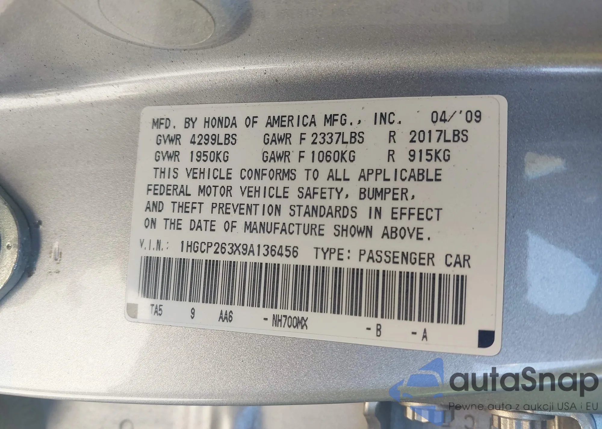 • VIN: 1HGCP263X9A136456
