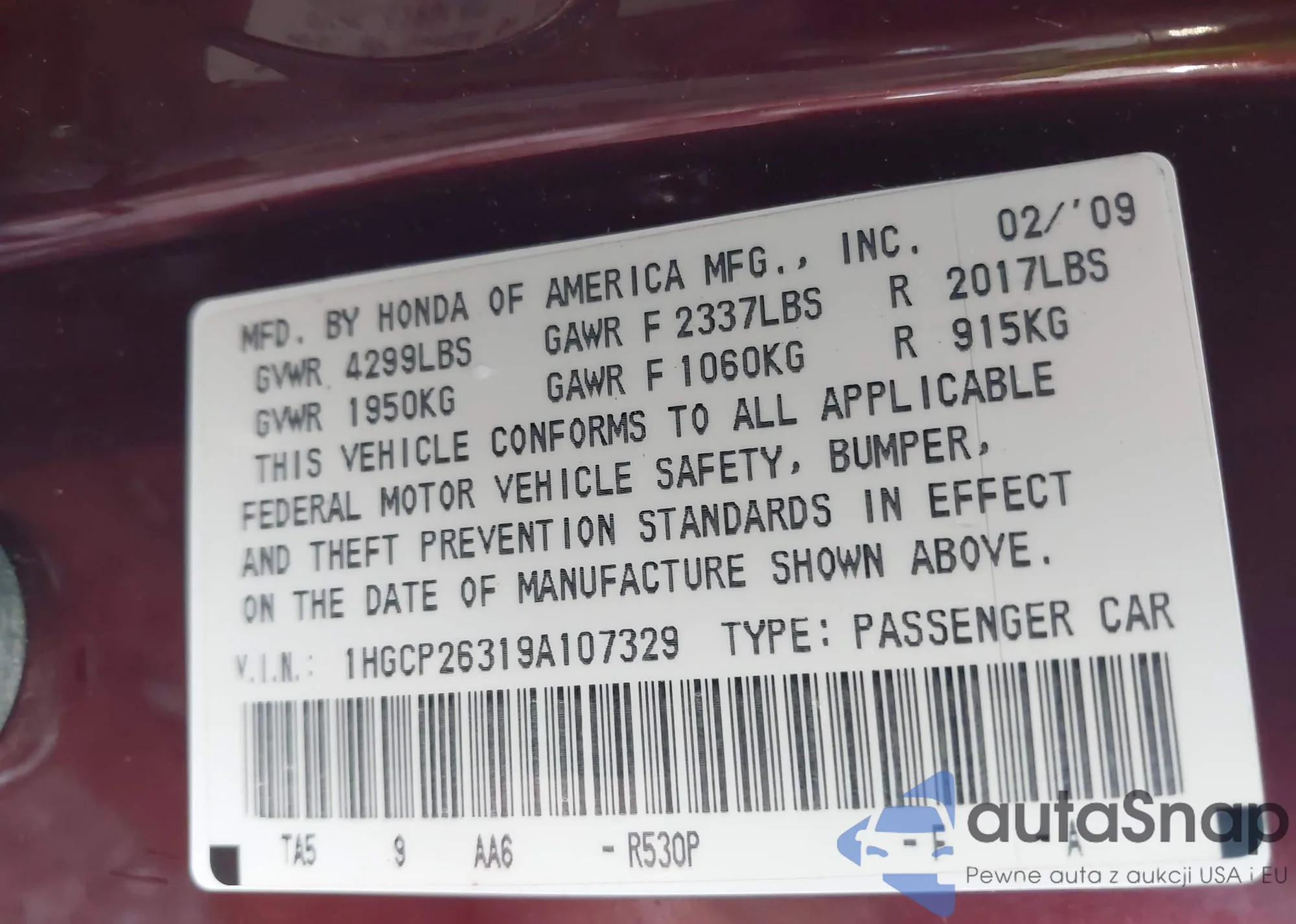 VIN: 1HGCP26319A107329