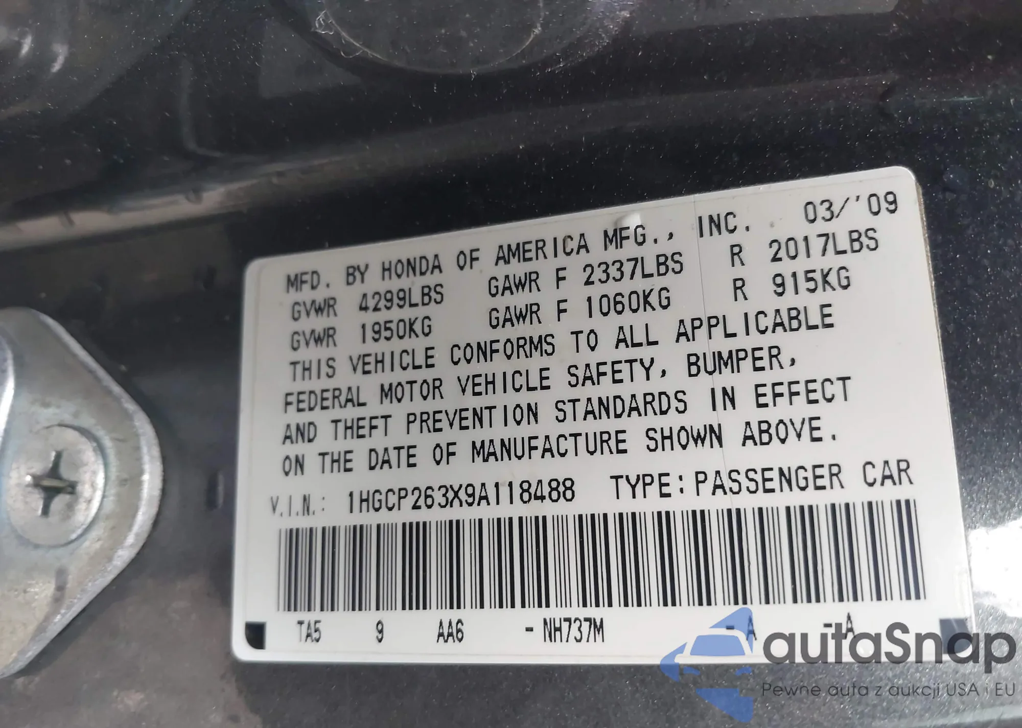 VIN: 1HGCP263X9A118488