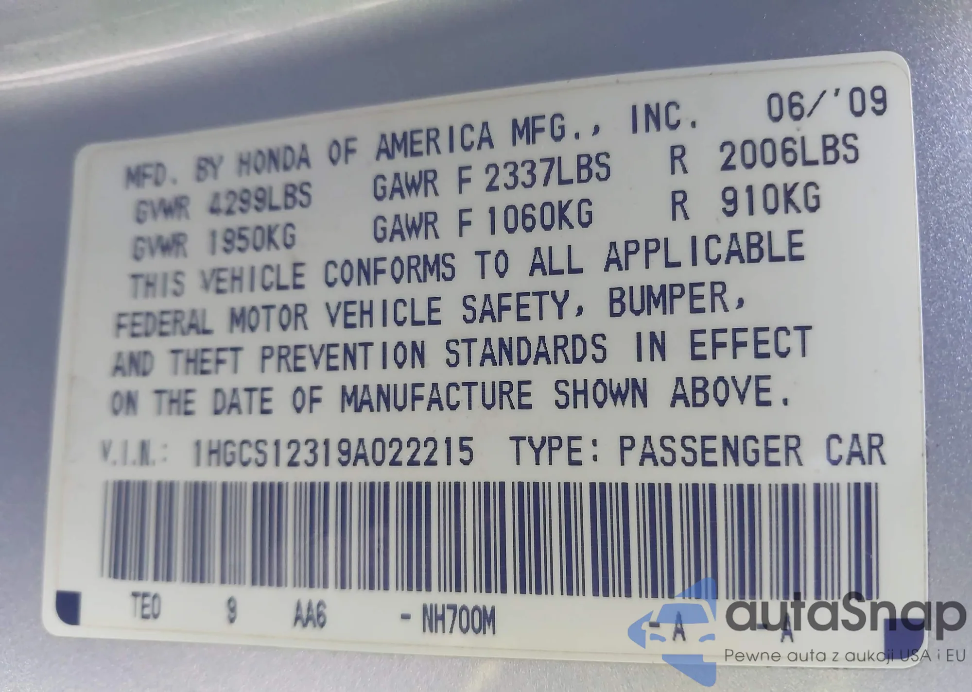 VIN: 1HGCS12319A022215