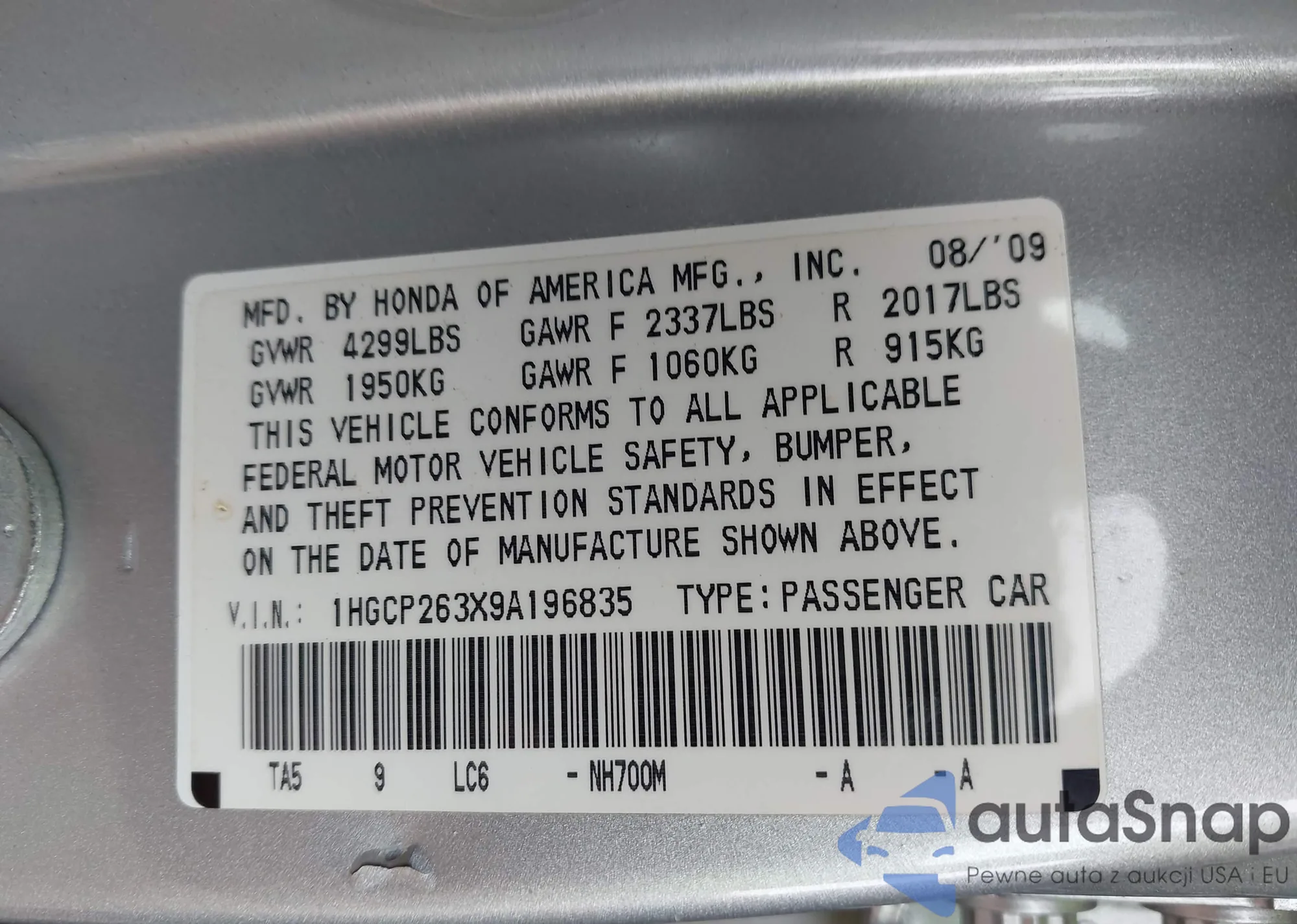 VIN: 1HGCP263X9A196835