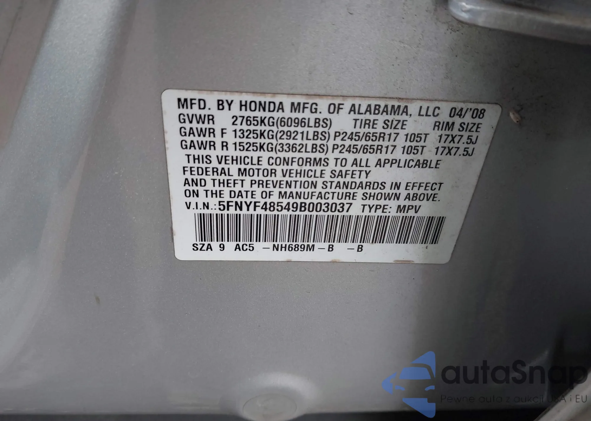 Samochód Honda Pilot 2009 (VIN 5FNYF48549B003037) nie był wcześniej licytowany. Dokumenty są czyste, przebieg odpowiada lub jest niższy niż średnia rynku. Sprzedaje go firma ubezpieczeniowa – polecamy zakup. Dostawa do portu zajmie ok. 6–8 tygodni.