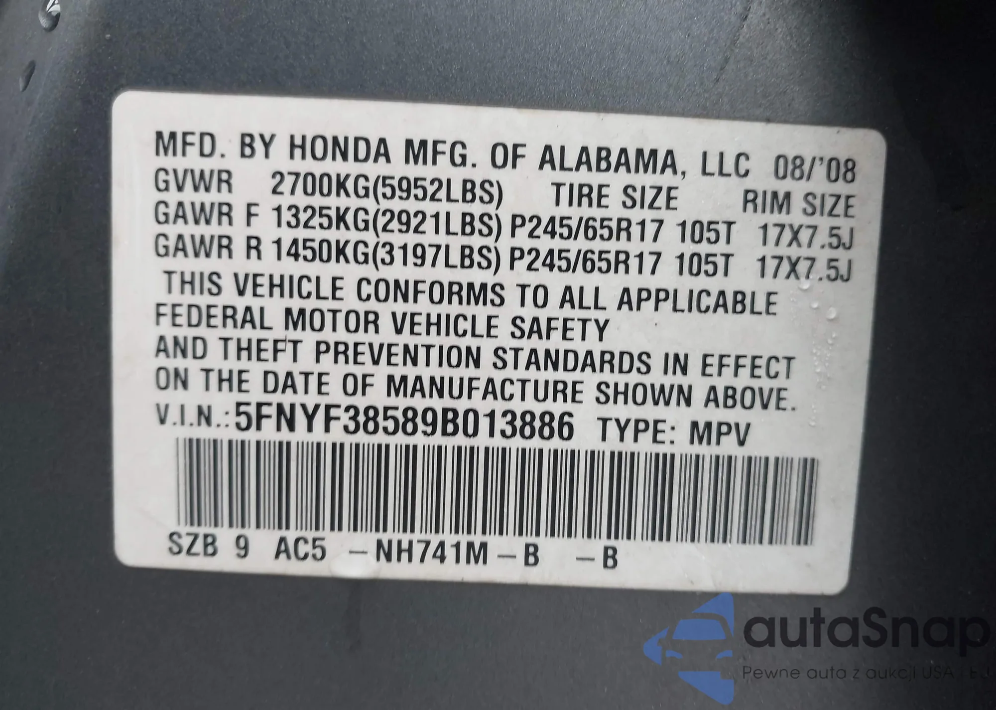 • VIN: 5FNYF38589B013886