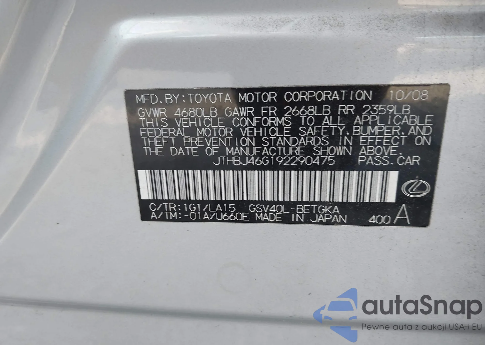 VIN: JTHBJ46G192290475