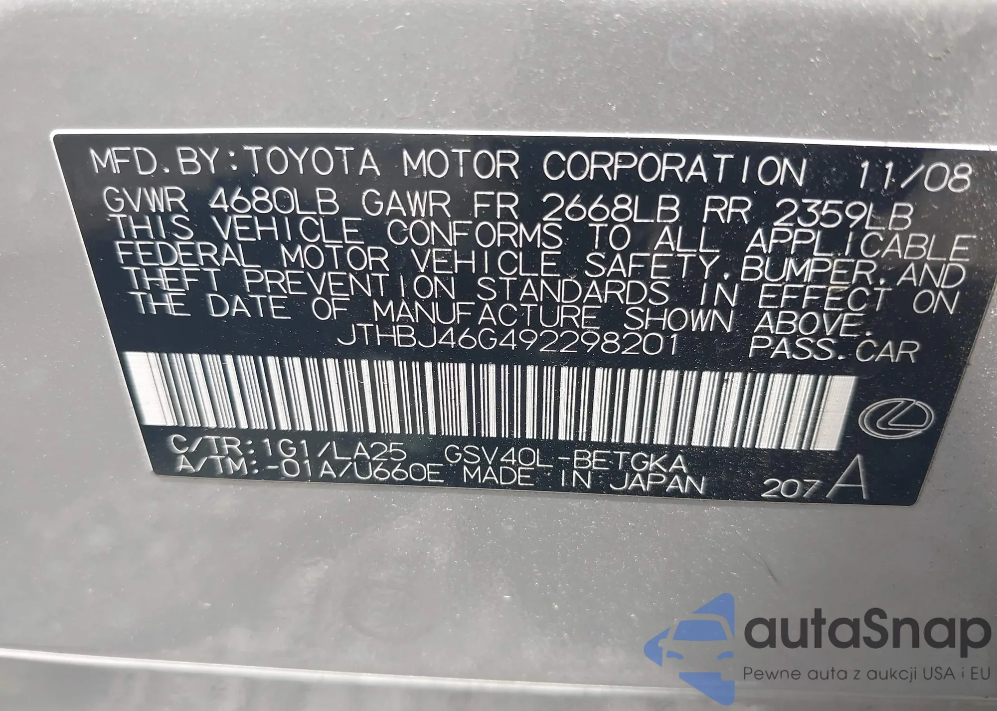 • VIN: JTHBJ46G492298201