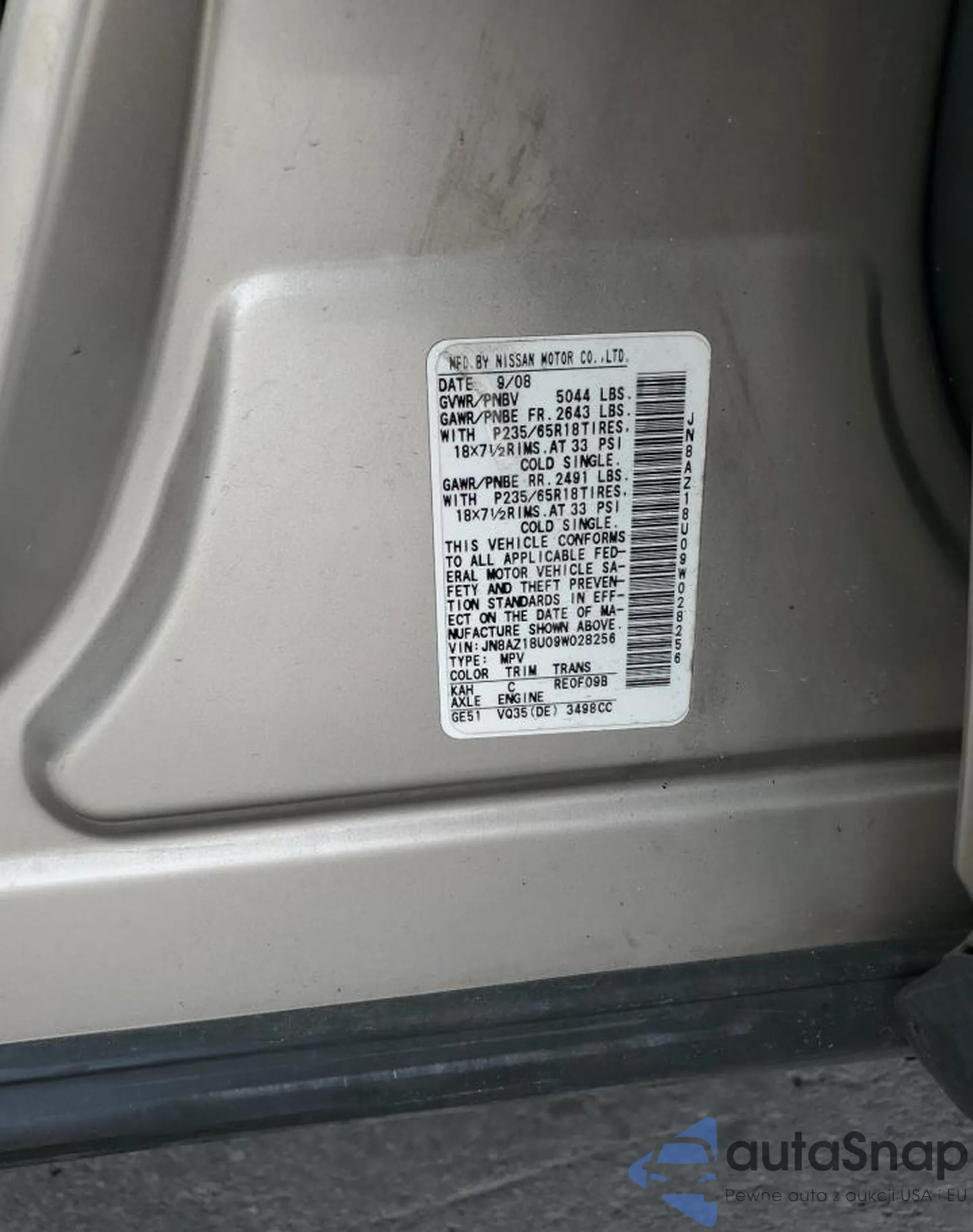 VIN: JN8AZ18U09W028256