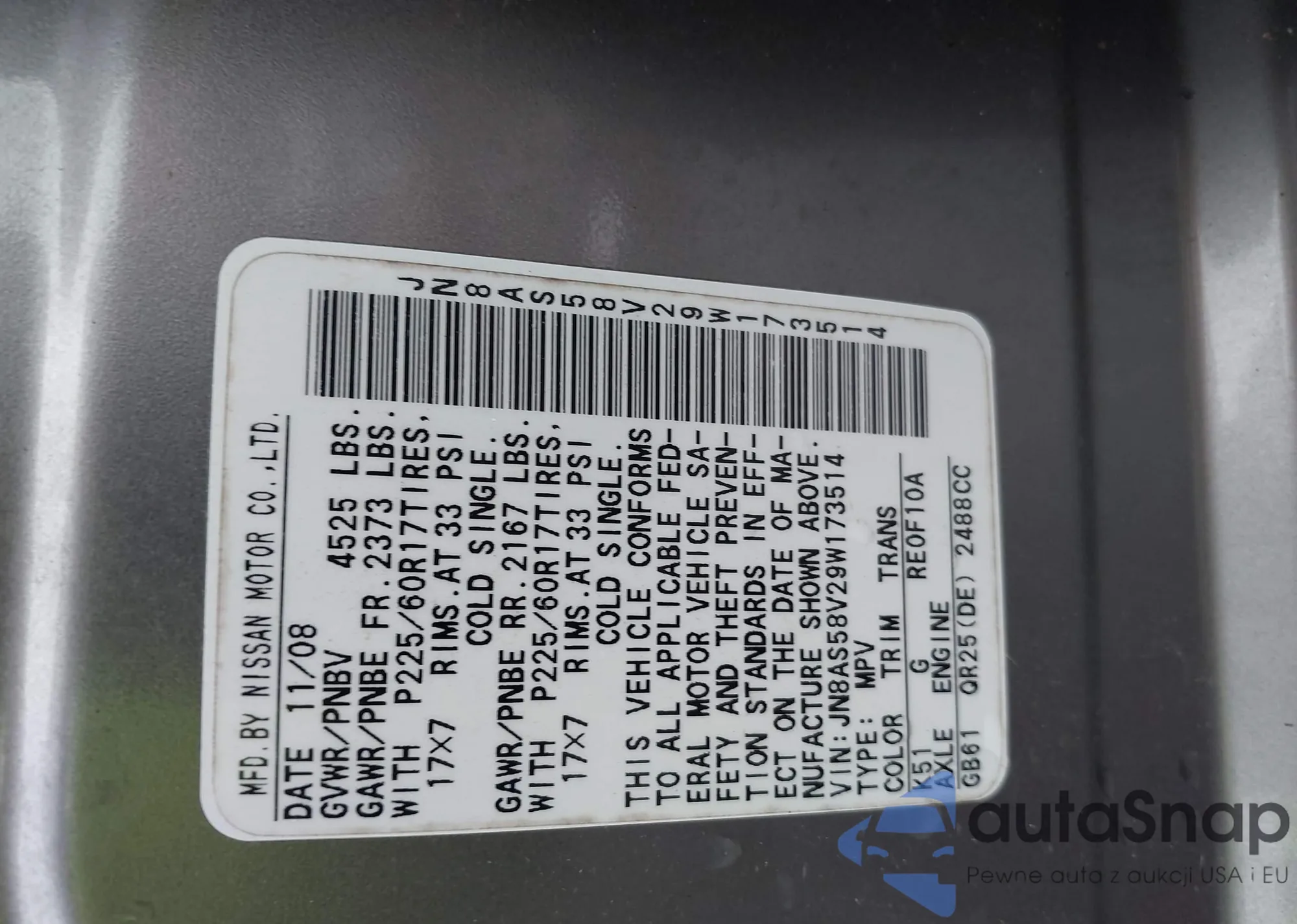 VIN: JN8AS58V29W173514