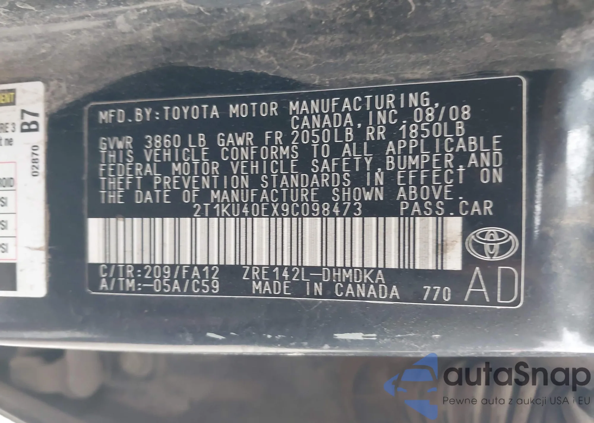 Samochód Toyota Matrix 2009 (VIN 2T1KU40EX9C098473) ma dokumenty uniemożliwiające rejestrację. Mogą pojawić się trudności przy eksporcie i rejestracji. Skontaktuj się z ekspertami AutaSnap w celu znalezienia alternatywy.
