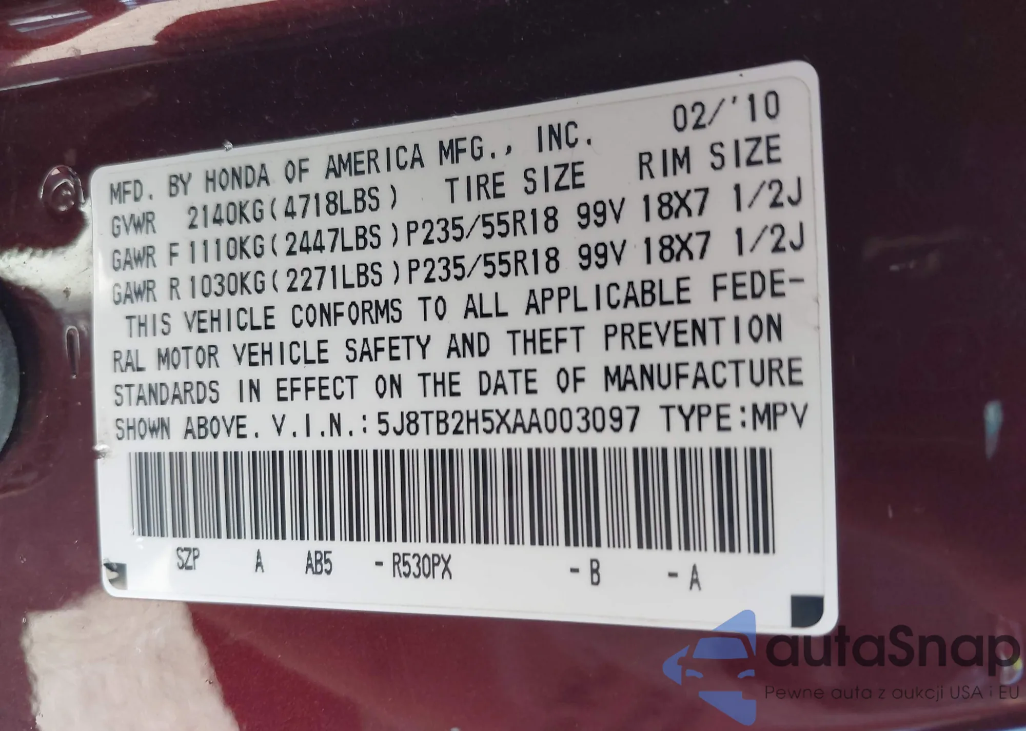 • VIN: 5J8TB2H5XAA003097
