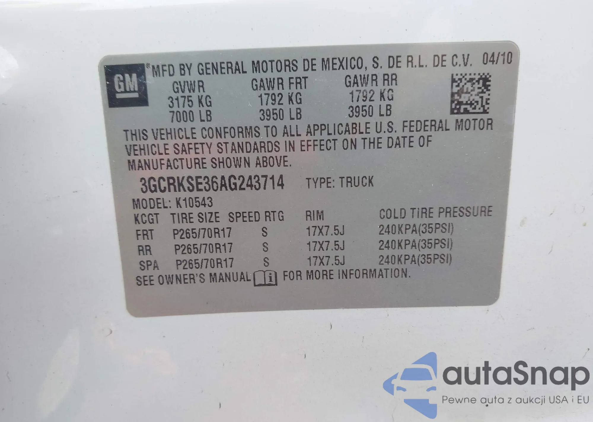VIN: 3GCRKSE36AG243714
