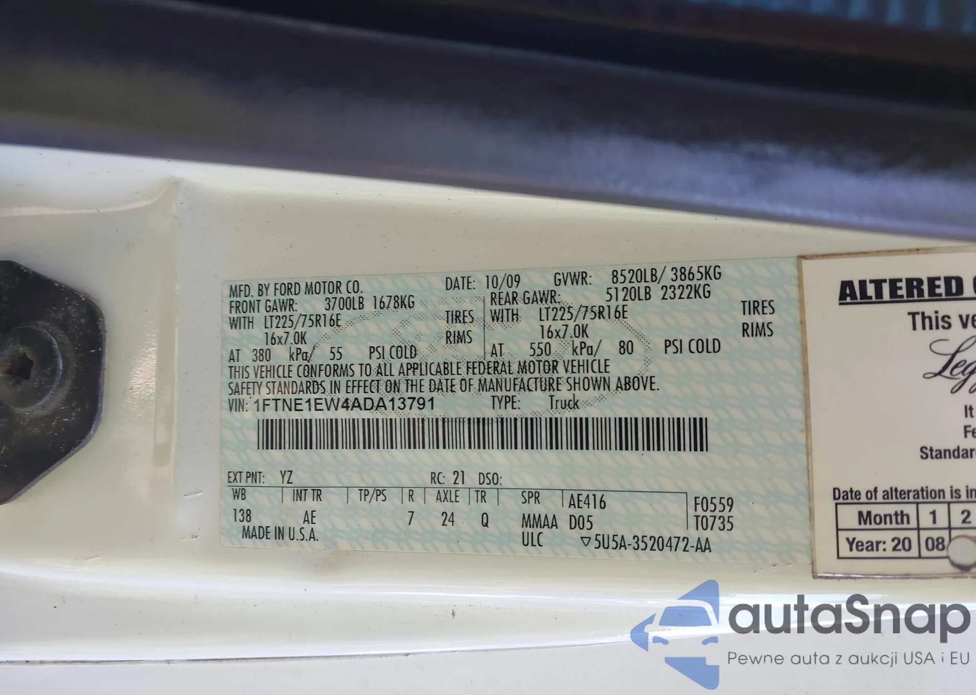 Samochód Ford Transit 2010 (VIN 1FTNE1EW4ADA13791) nie był wcześniej licytowany. Dokumenty są czyste, przebieg odpowiada lub jest niższy niż średnia rynku. Sprzedaje go firma ubezpieczeniowa – polecamy zakup. Dostawa do portu zajmie ok. 6–8 tygodni.