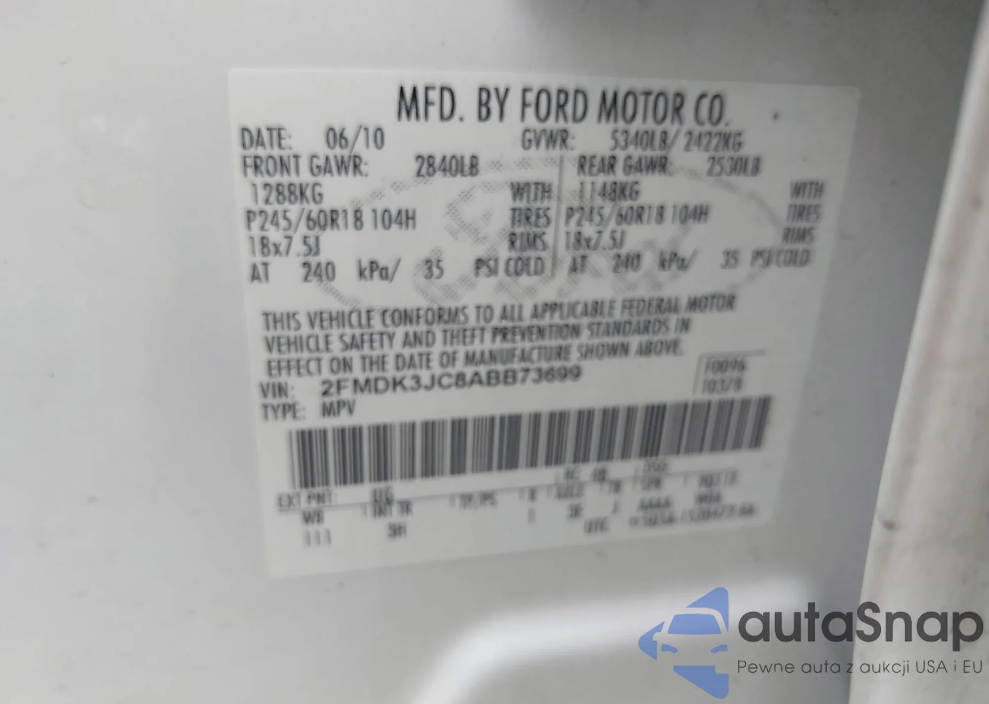 • VIN: 2FMDK3JC8ABB73699