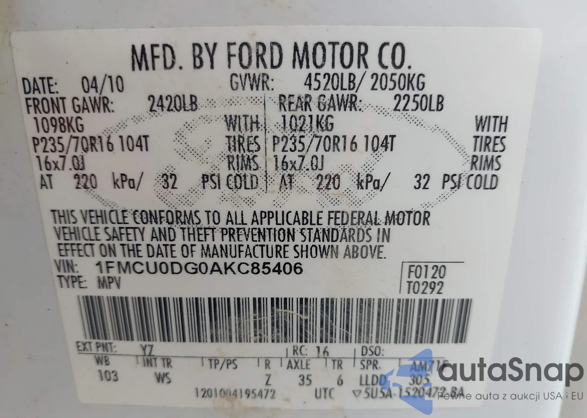 VIN: 1FMCU0DG0AKC85406