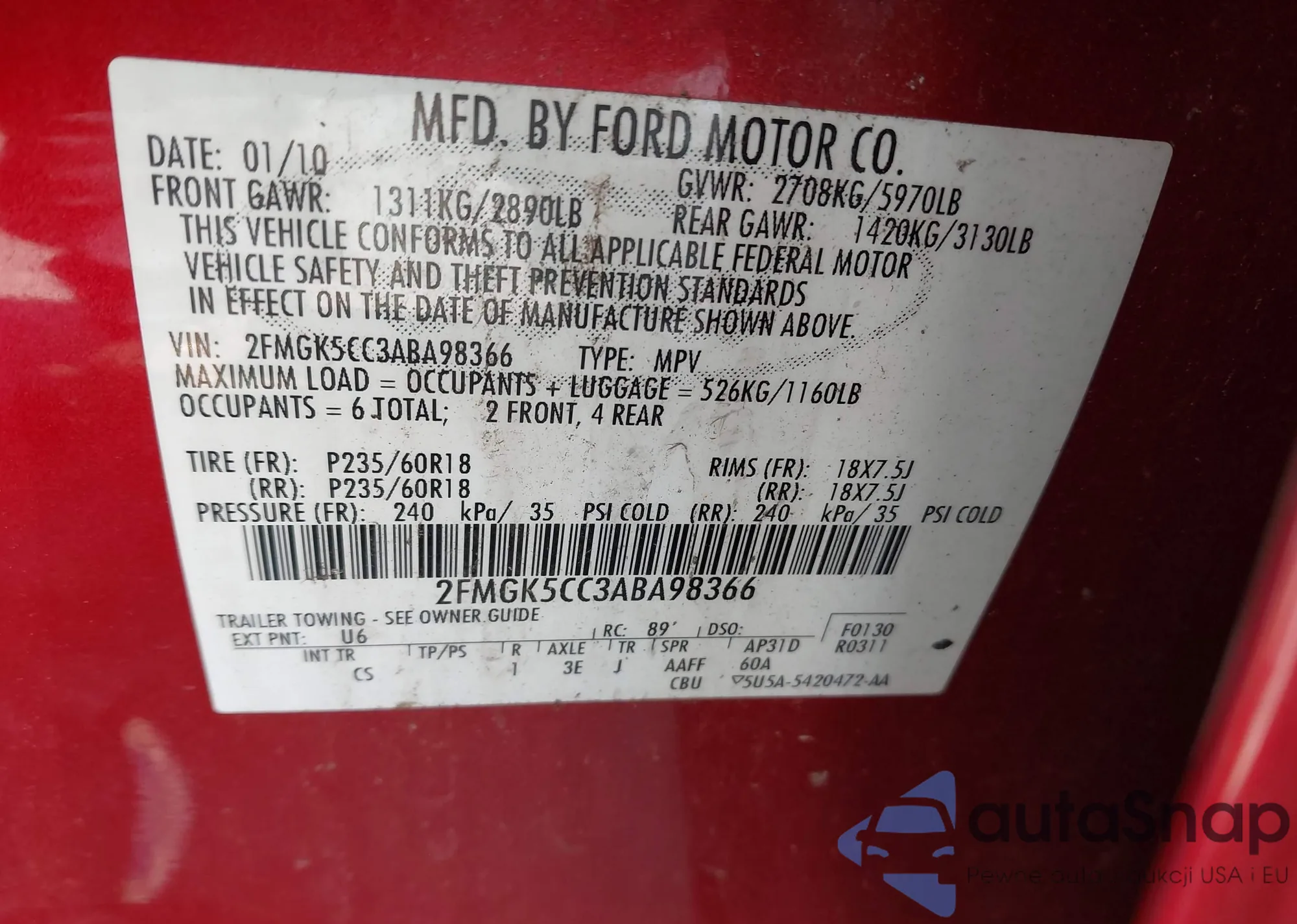 Samochód Ford Flex 2010 (VIN 2FMGK5CC3ABA98366) nie był wcześniej licytowany. Dokumenty są czyste, przebieg odpowiada lub jest niższy niż średnia rynku. Sprzedaje go firma ubezpieczeniowa – polecamy zakup. Dostawa do portu zajmie ok. 6–8 tygodni.