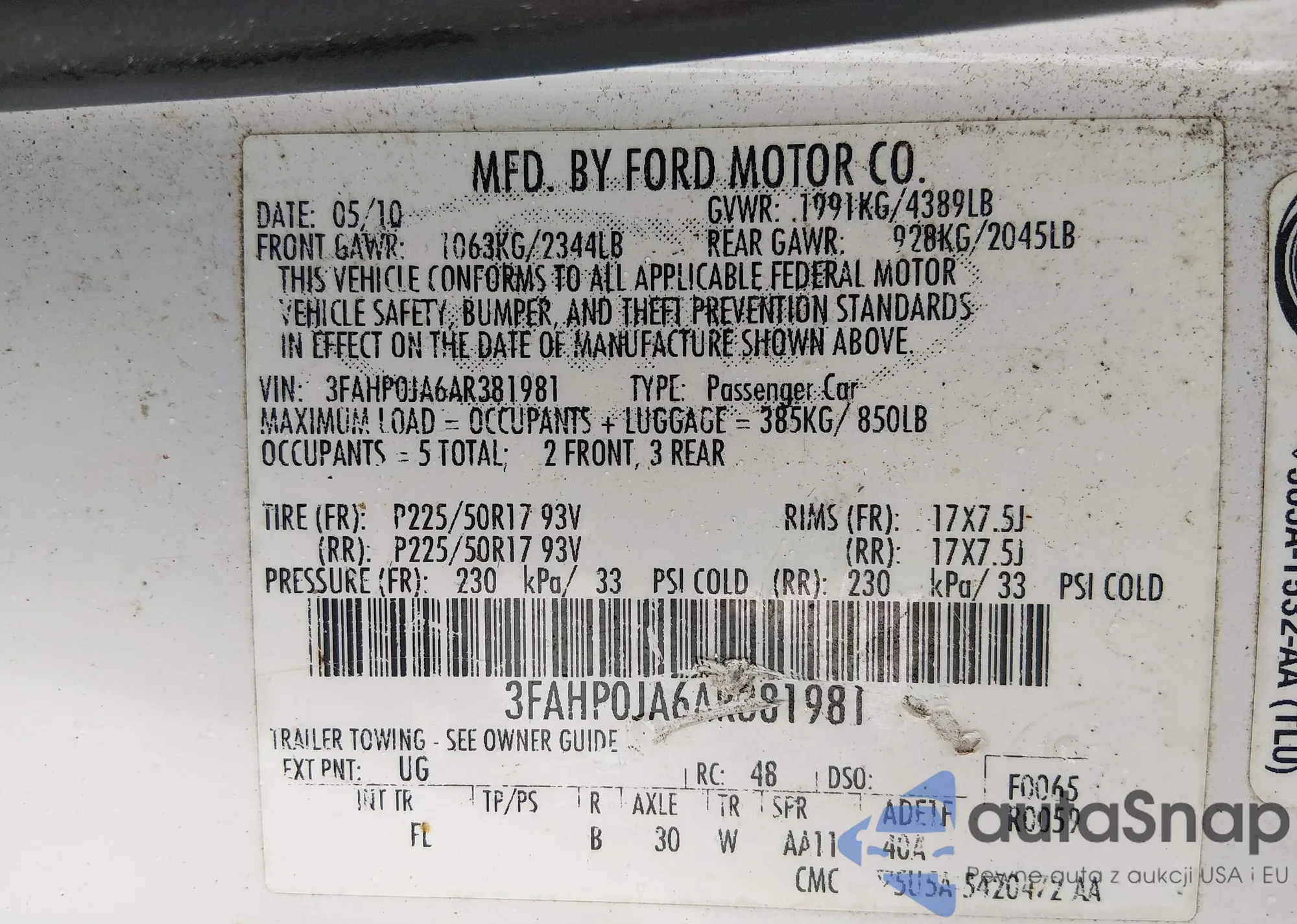 Samochód Ford Fusion 2010 (VIN 3FAHP0JA6AR381981) nie był wcześniej licytowany. Dokumenty są czyste, przebieg odpowiada lub jest niższy niż średnia rynku. Sprzedaje go firma ubezpieczeniowa – polecamy zakup. Dostawa do portu zajmie ok. 6–8 tygodni.