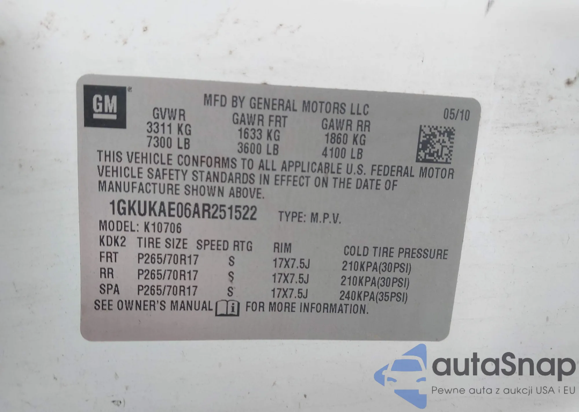 • VIN: 1GKUKAE06AR251522