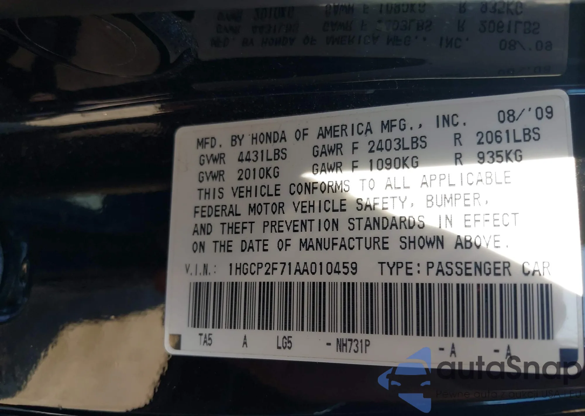 VIN: 1HGCP2F71AA010459