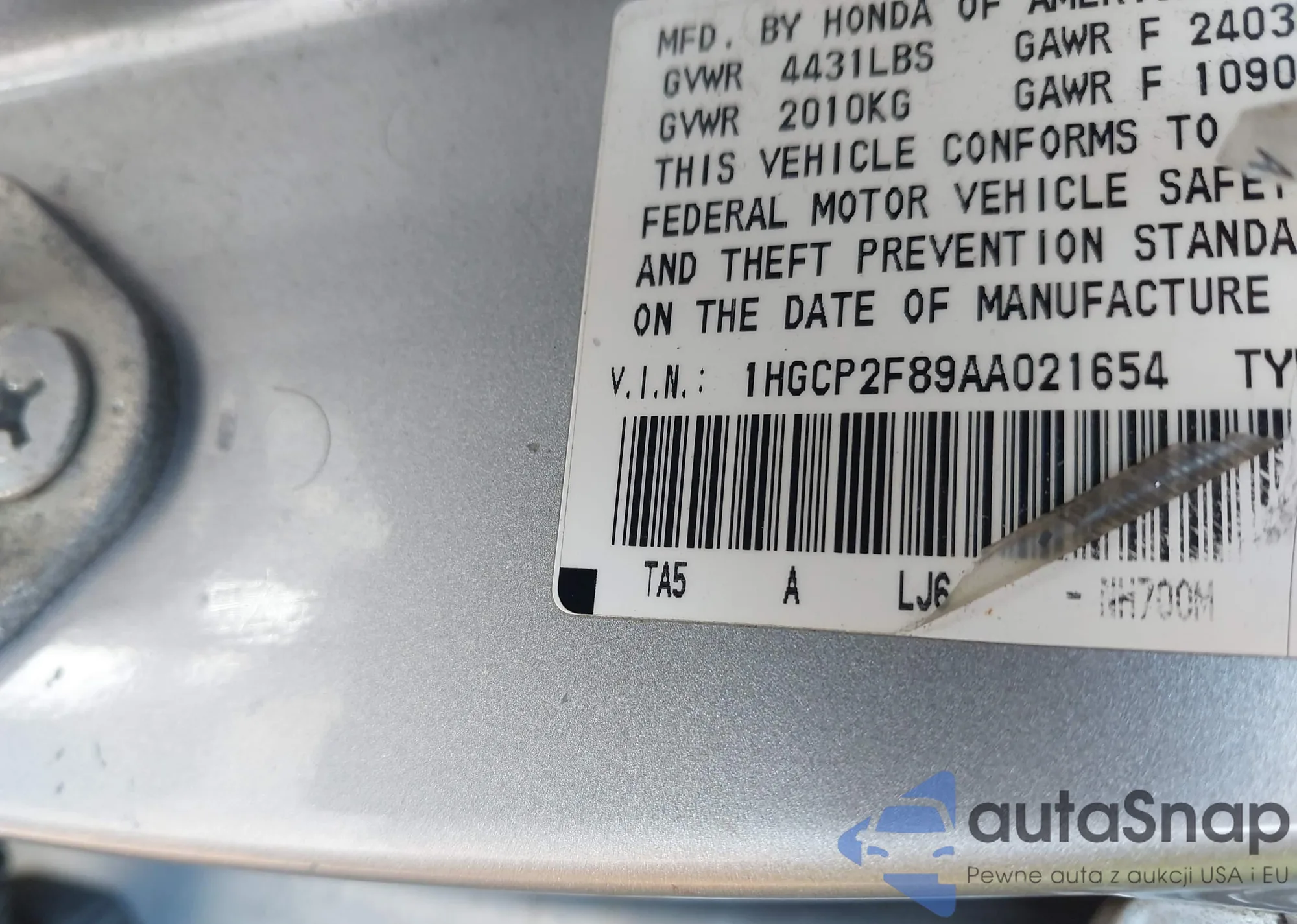Samochód Honda Accord 2010 (VIN 1HGCP2F89AA021654) nie był wcześniej licytowany. Dokumenty są czyste, przebieg odpowiada lub jest niższy niż średnia rynku. Sprzedaje go firma ubezpieczeniowa – polecamy zakup. Dostawa do portu zajmie ok. 6–8 tygodni.