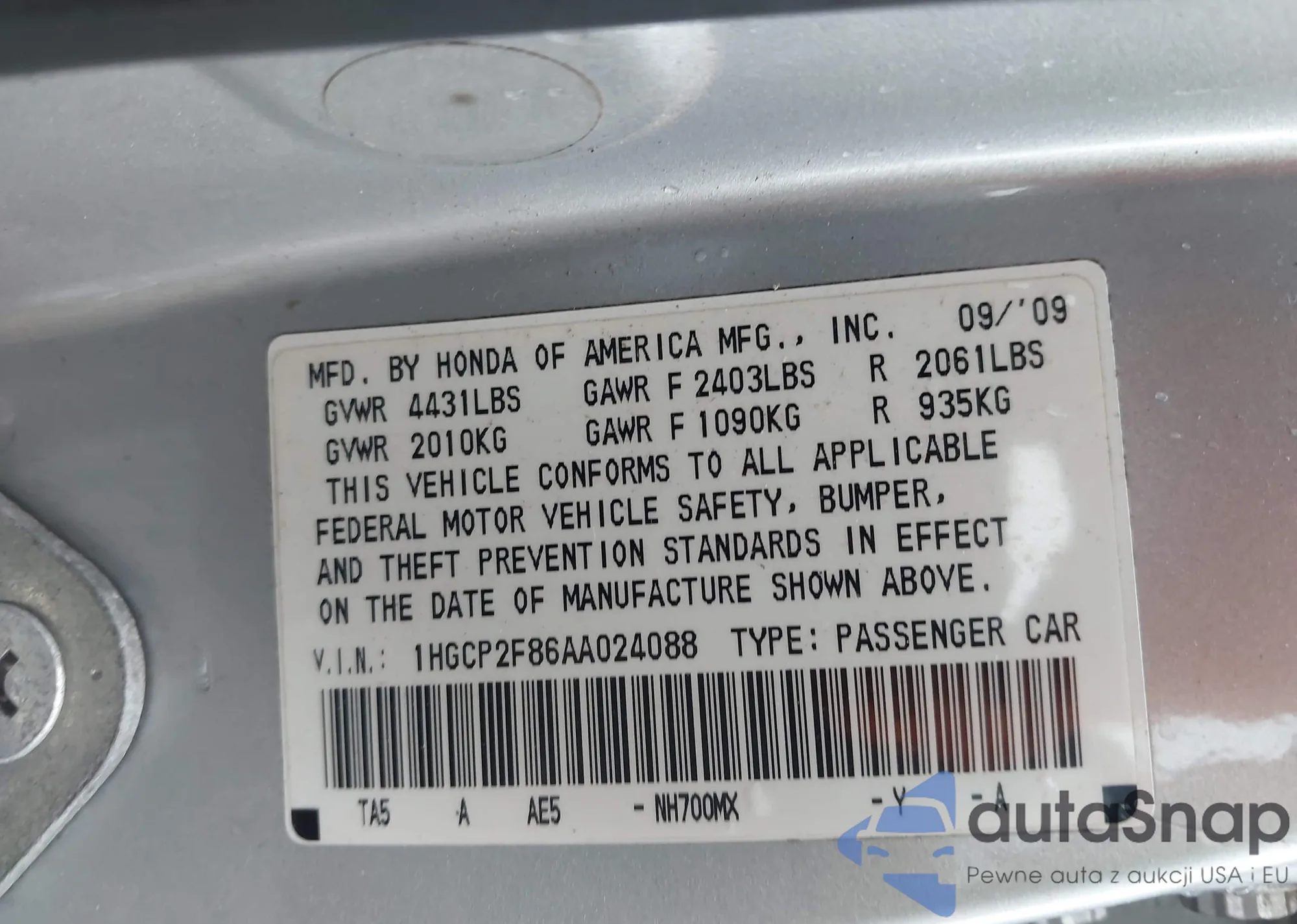 VIN: 1HGCP2F86AA024088