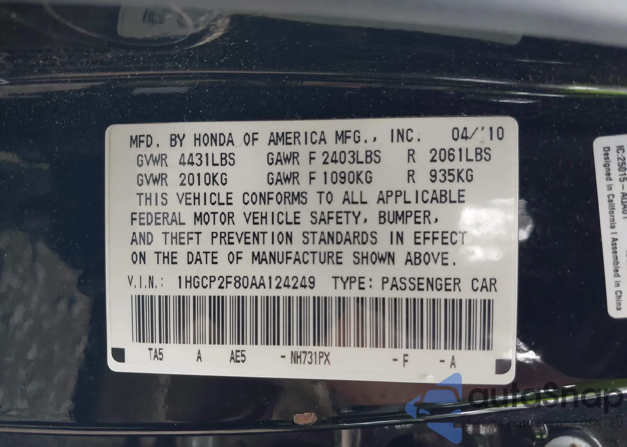 VIN: 1HGCP2F80AA124249