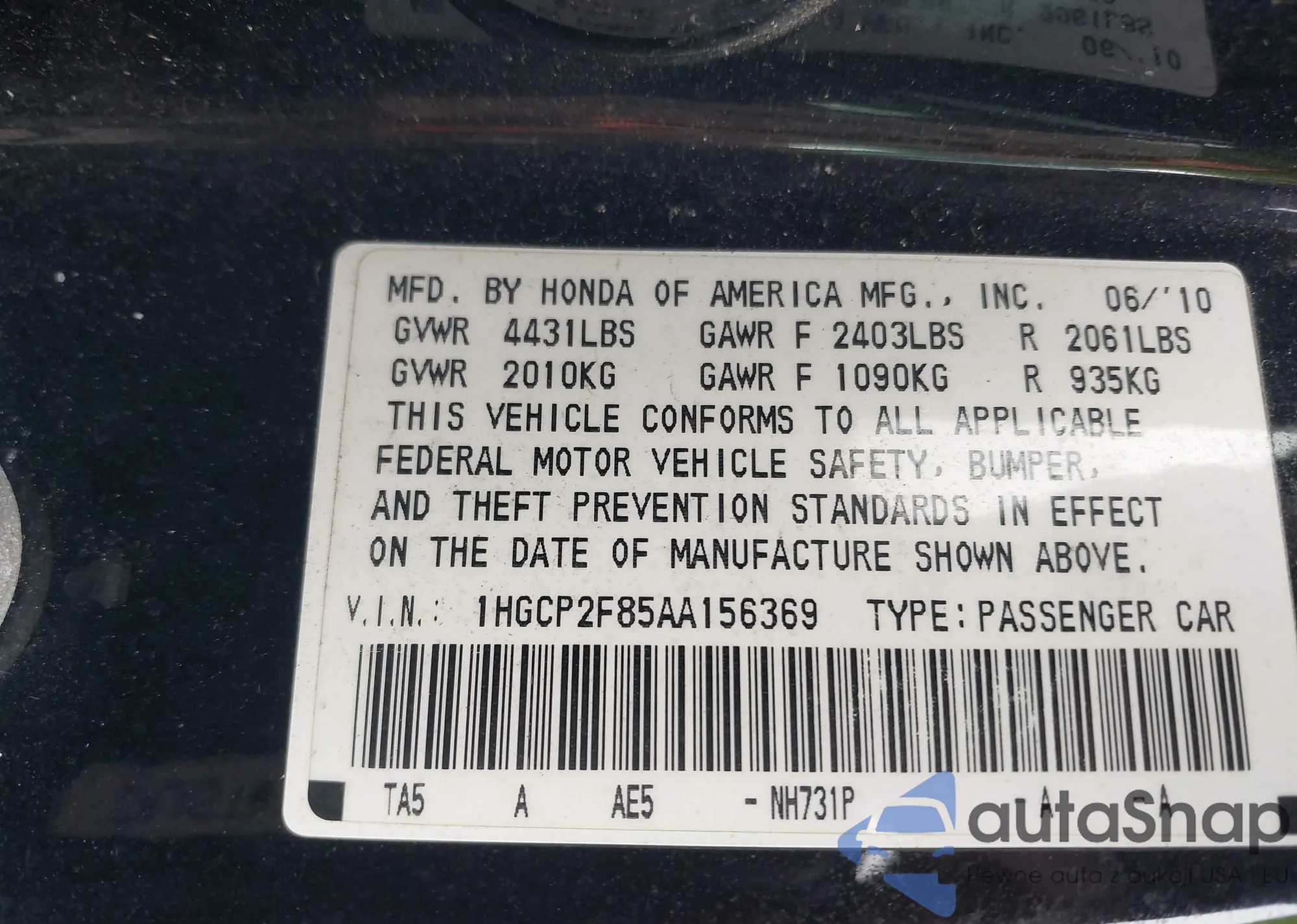 VIN: 1HGCP2F85AA156369