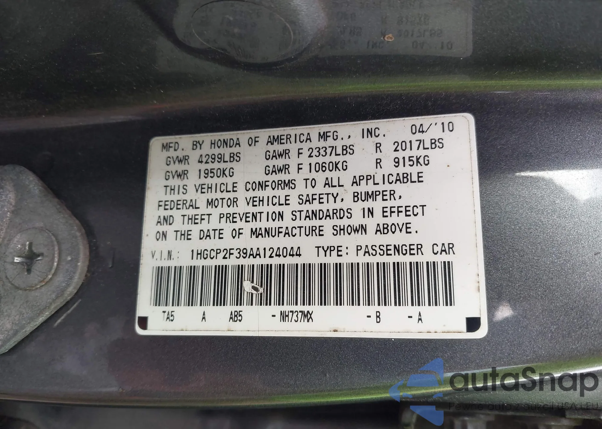 VIN: 1HGCP2F39AA124044