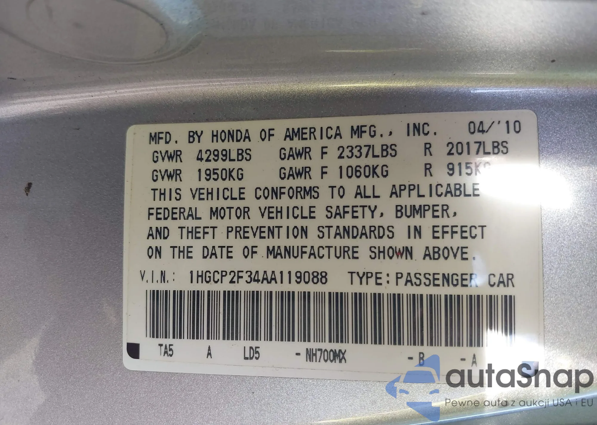 VIN: 1HGCP2F34AA119088