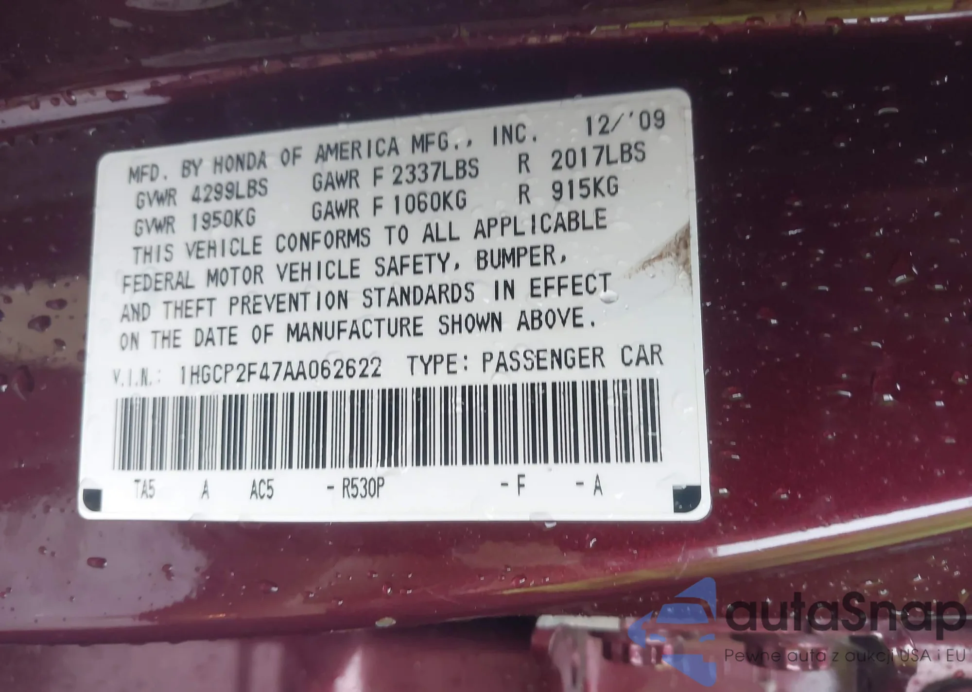 VIN: 1HGCP2F47AA062622