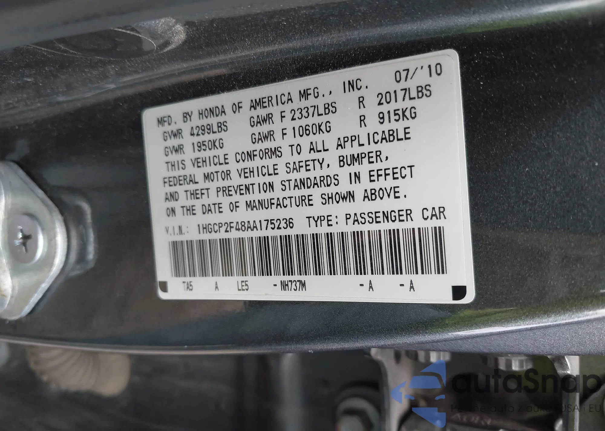 • VIN: 1HGCP2F48AA175236