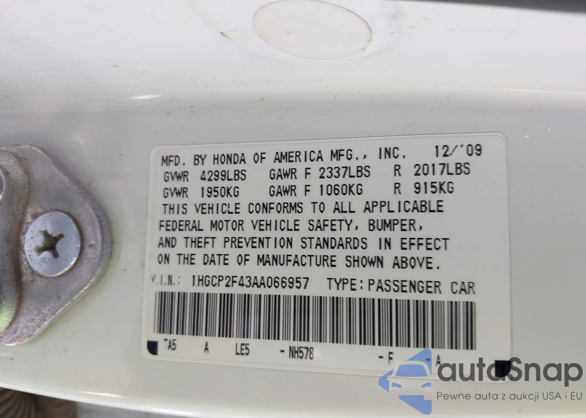 VIN: 1HGCP2F43AA066957