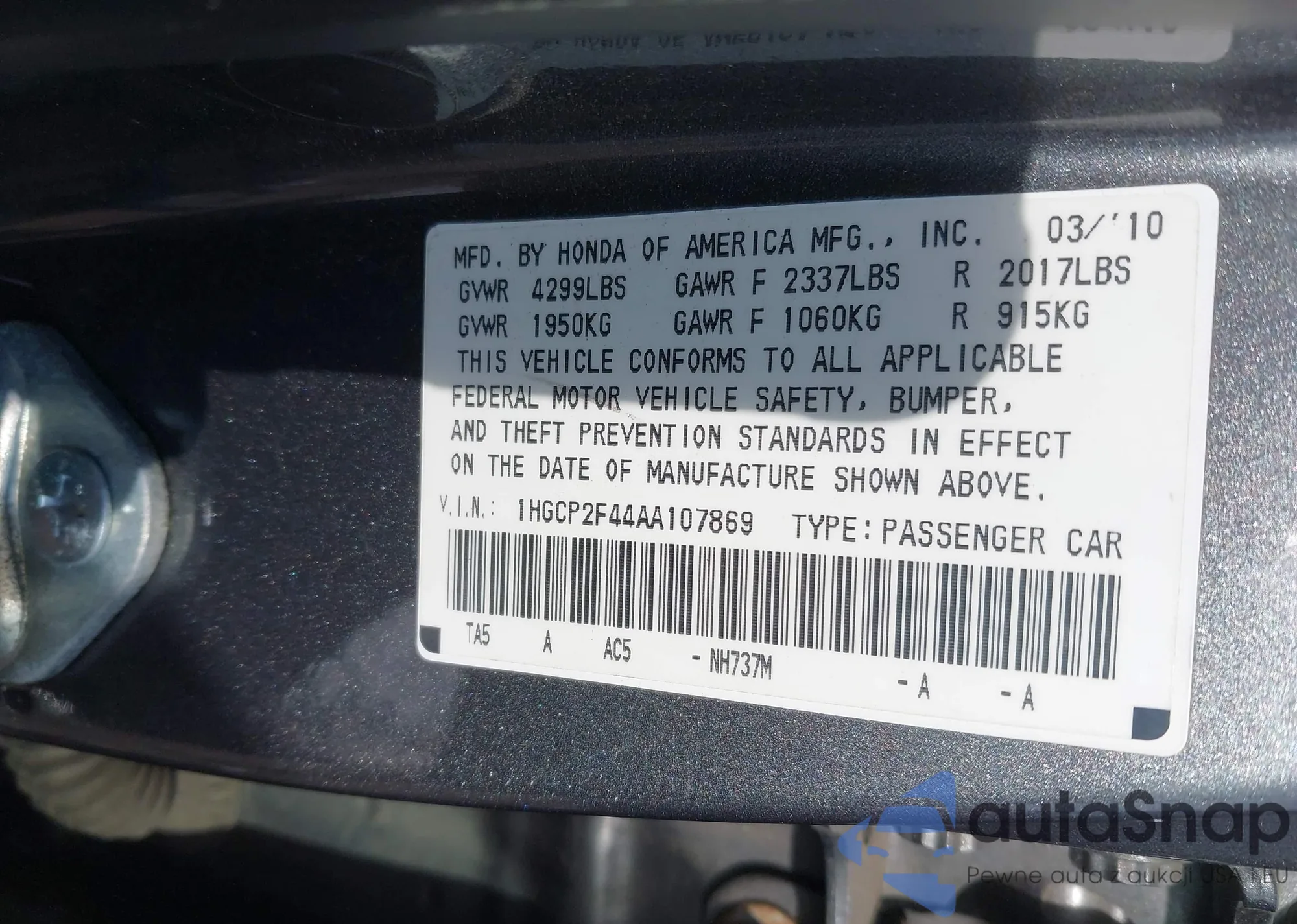 VIN: 1HGCP2F44AA107869