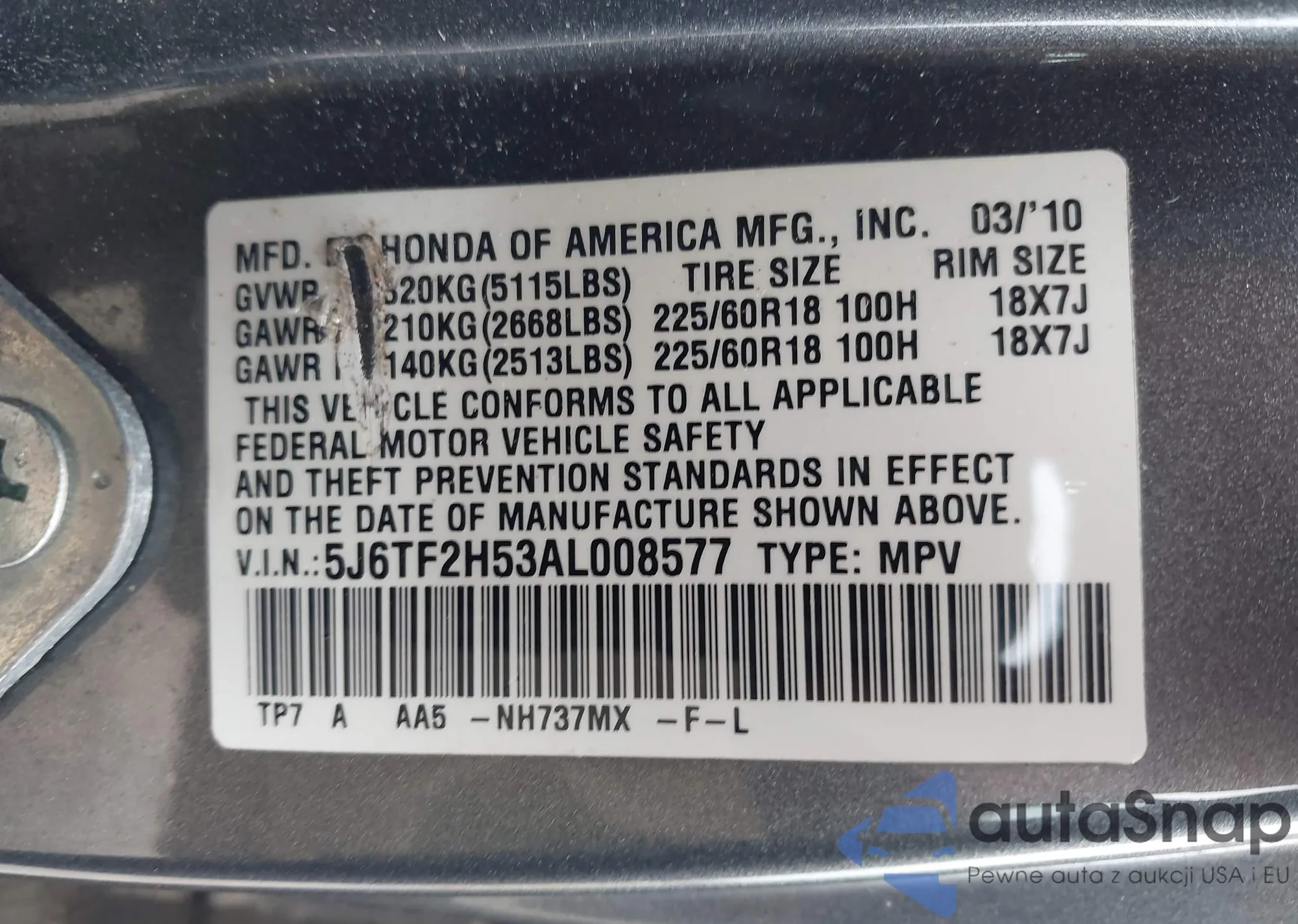 VIN: 5J6TF2H53AL008577