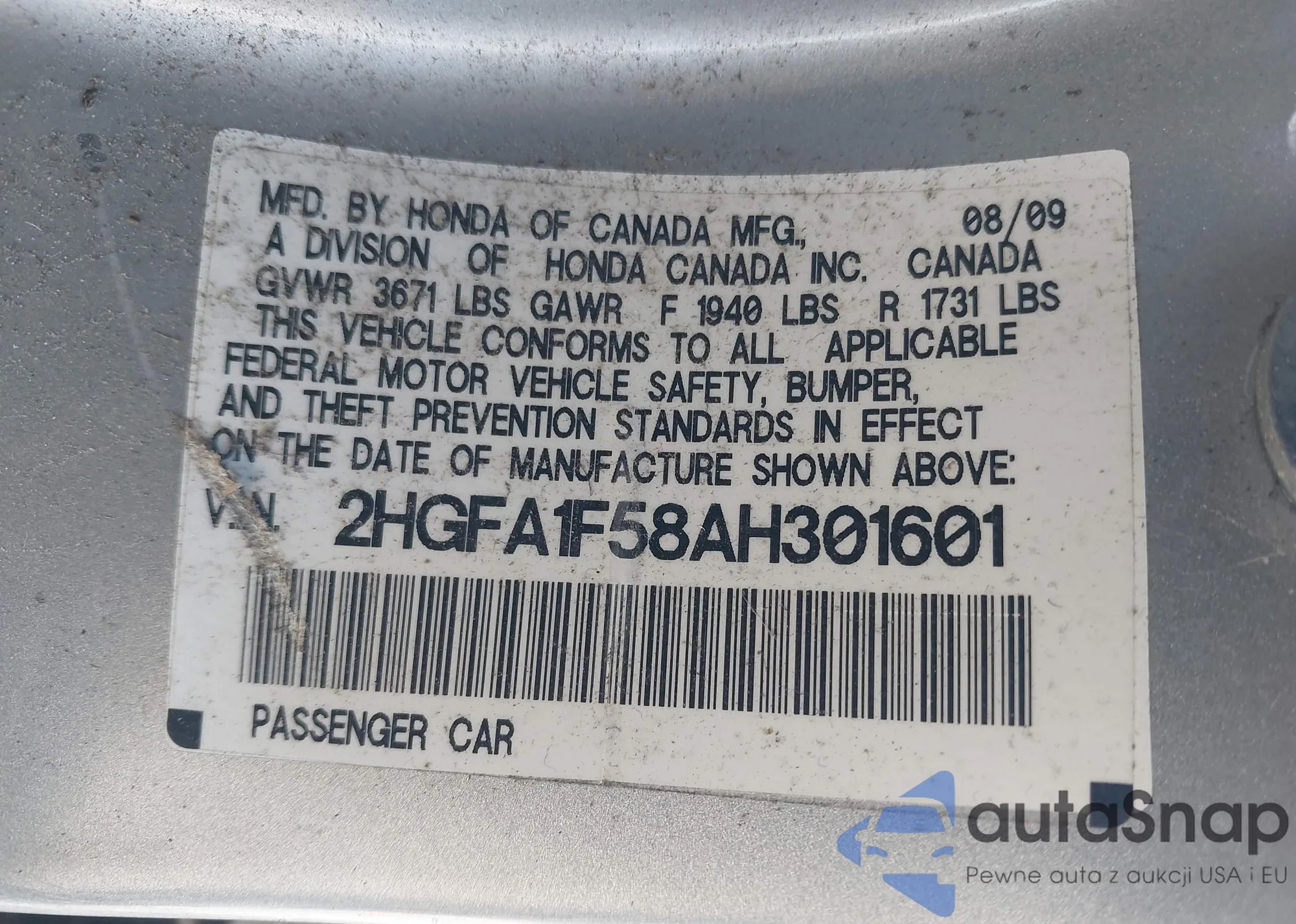 VIN: 2HGFA1F58AH301601