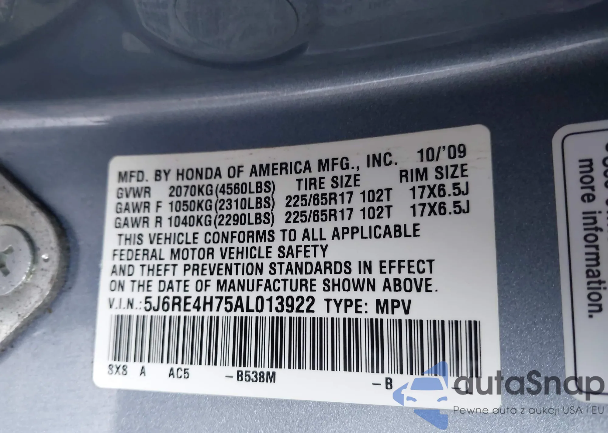 VIN: 5J6RE4H75AL013922