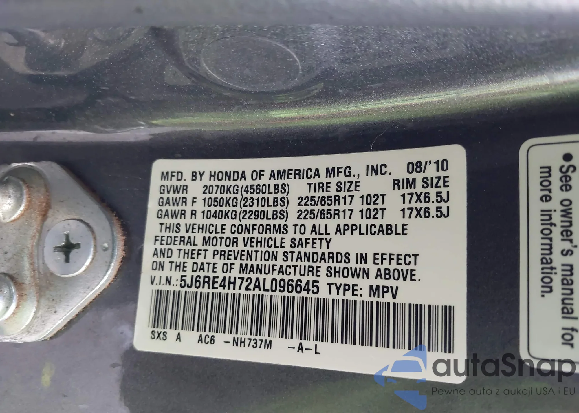 Samochód Honda CR-V 2010 (VIN 5J6RE4H72AL096645) nie był wcześniej licytowany. Dokumenty są czyste, przebieg odpowiada lub jest niższy niż średnia rynku. Sprzedaje go firma ubezpieczeniowa – polecamy zakup. Dostawa do portu zajmie ok. 6–8 tygodni.