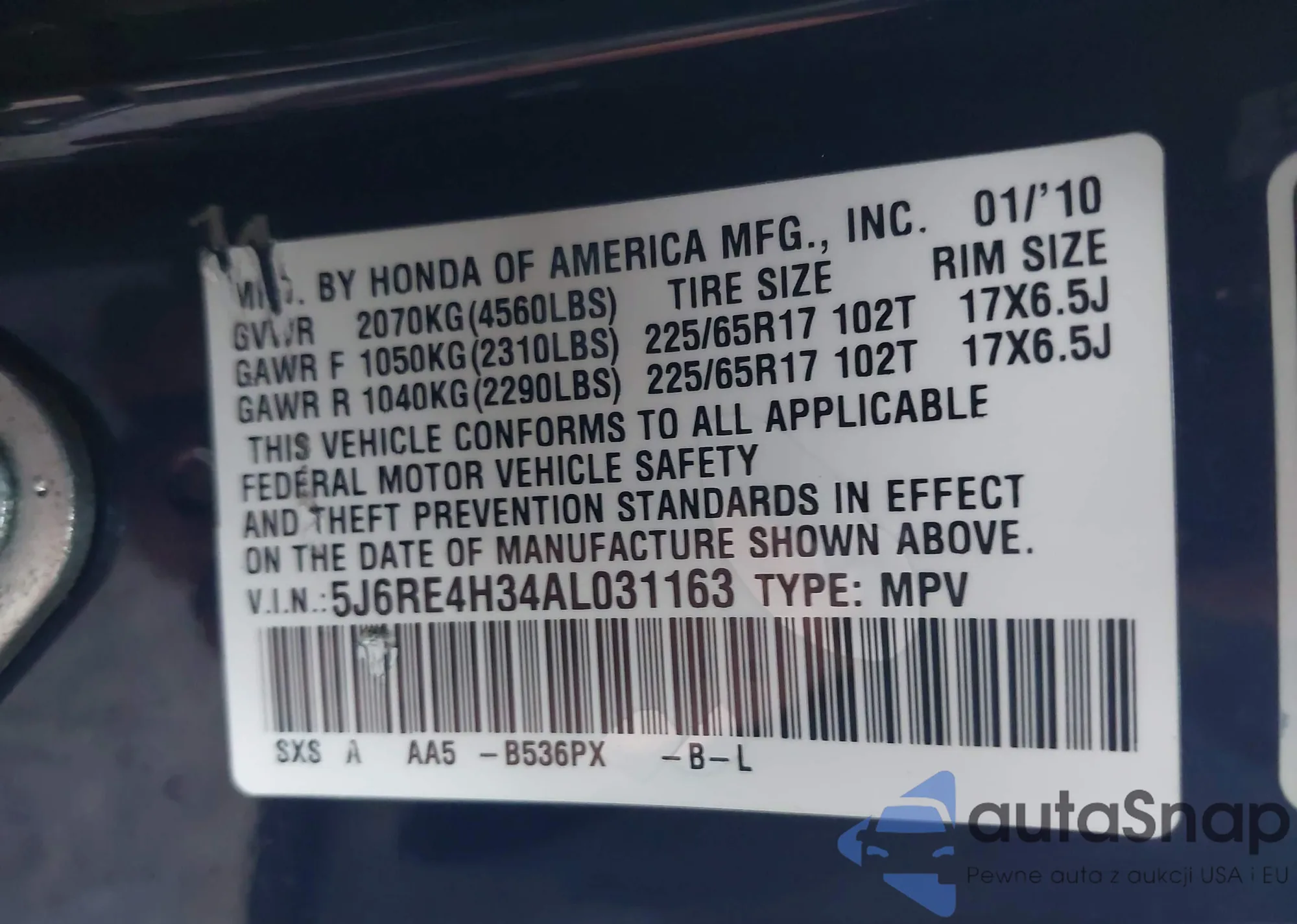 VIN: 5J6RE4H34AL031163