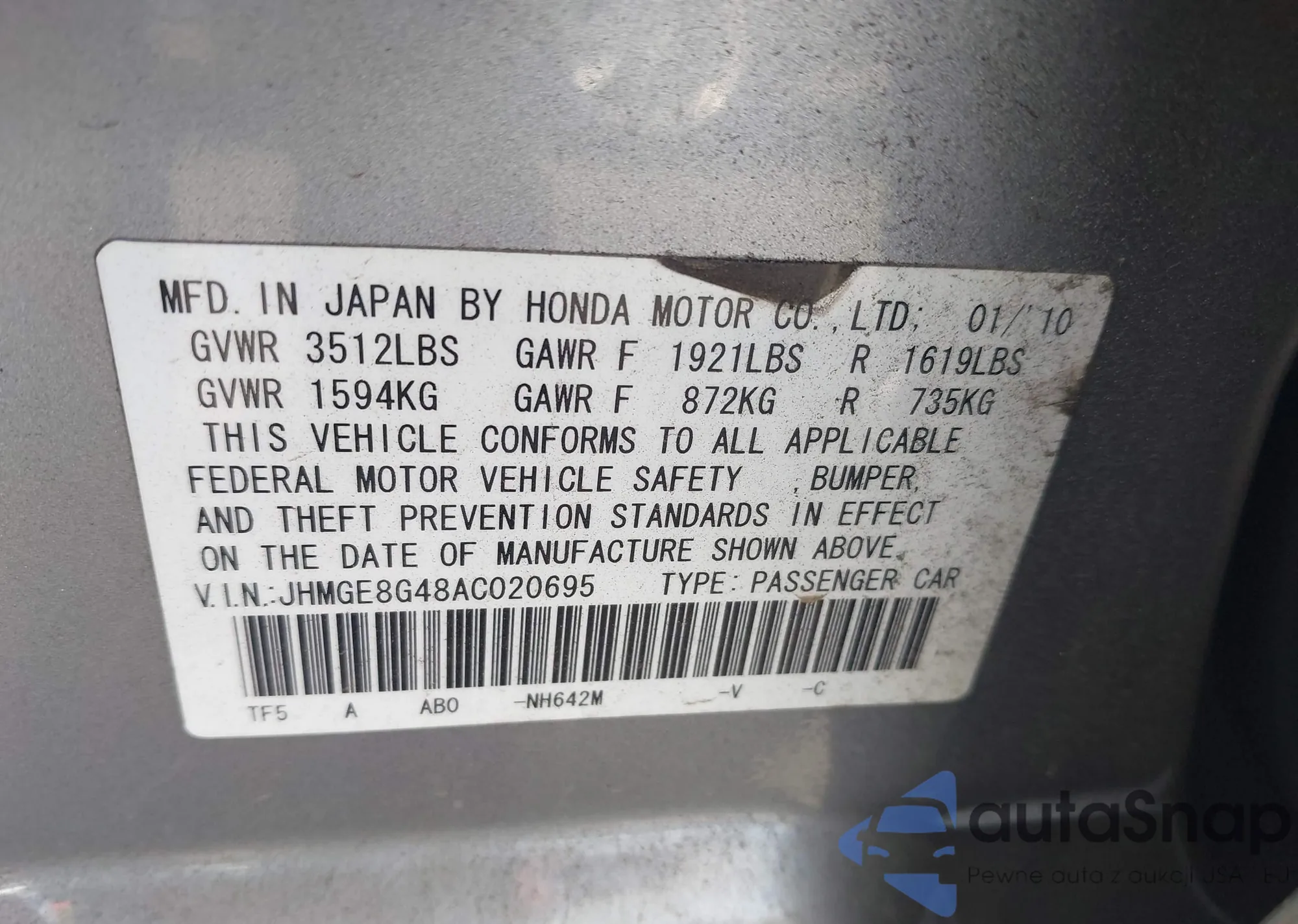 VIN: JHMGE8G48AC020695