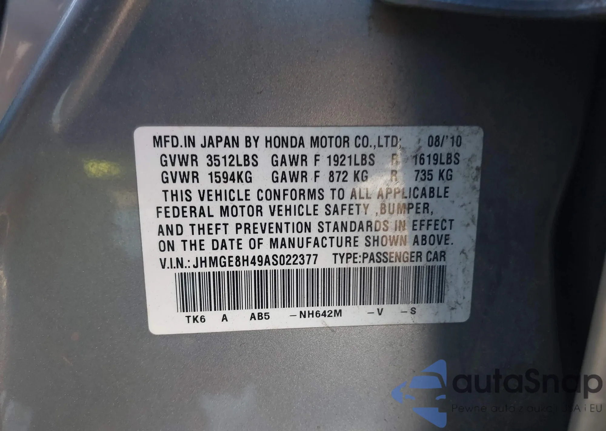 VIN: JHMGE8H49AS022377