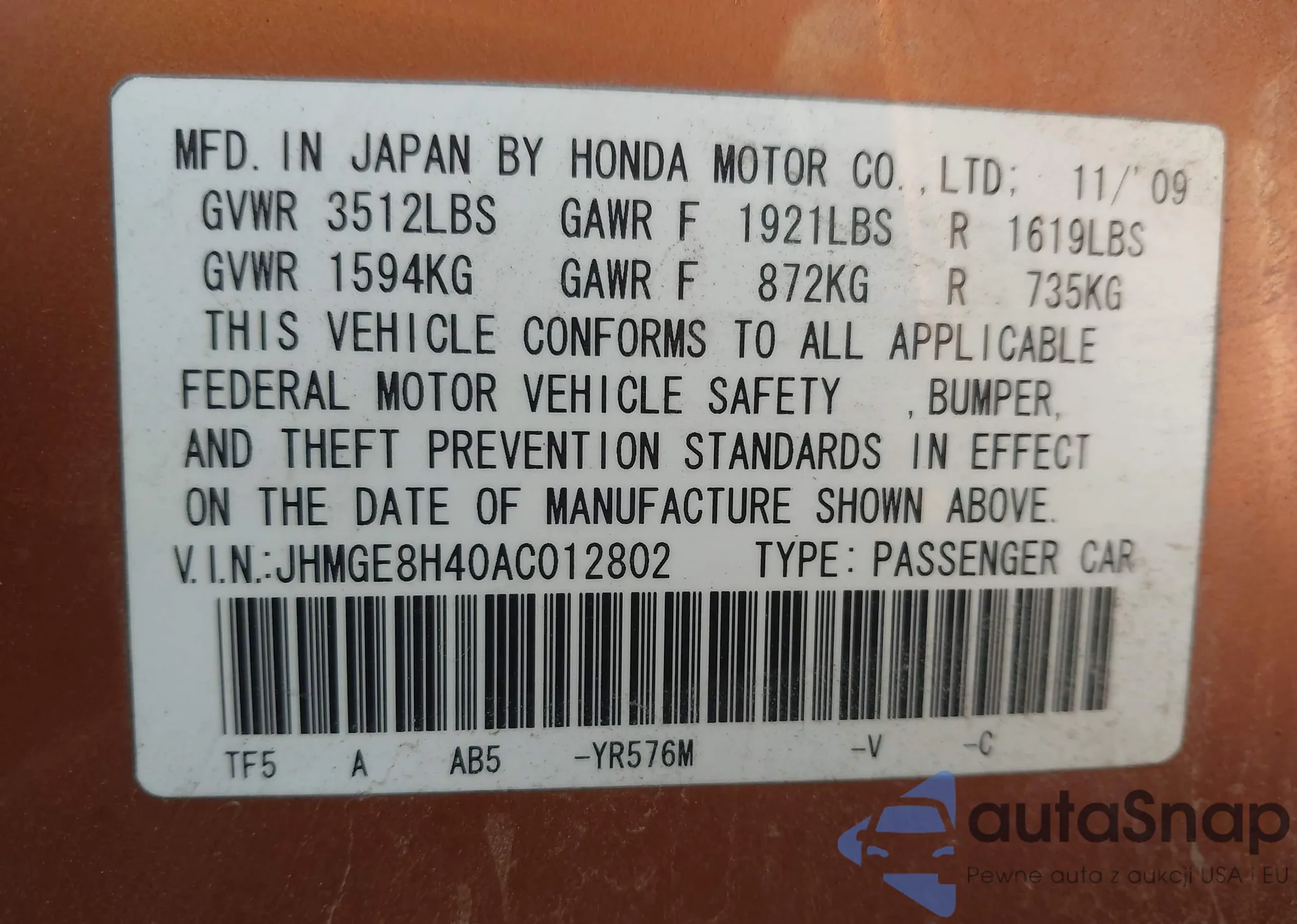 VIN: JHMGE8H40AC012802