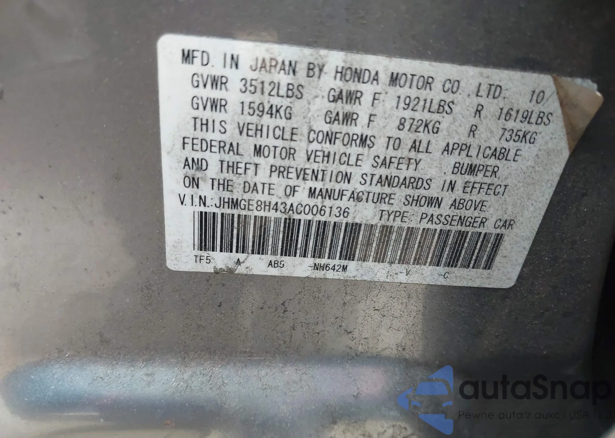 • VIN: JHMGE8H43AC006136