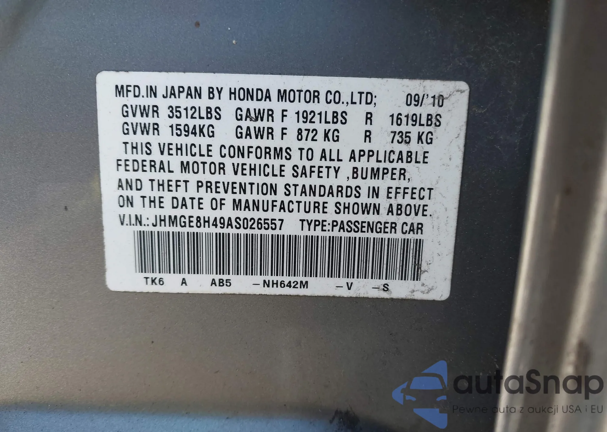 VIN: JHMGE8H49AS026557
