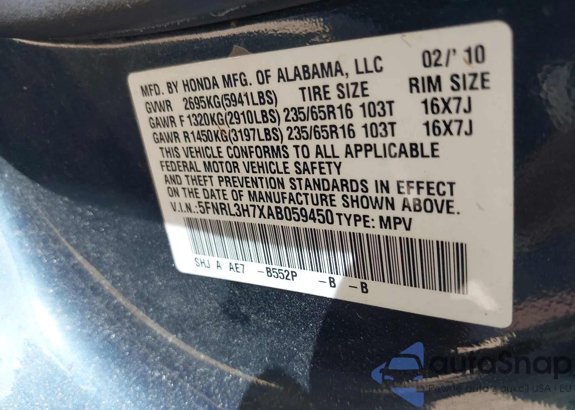 VIN: 5FNRL3H7XAB059450