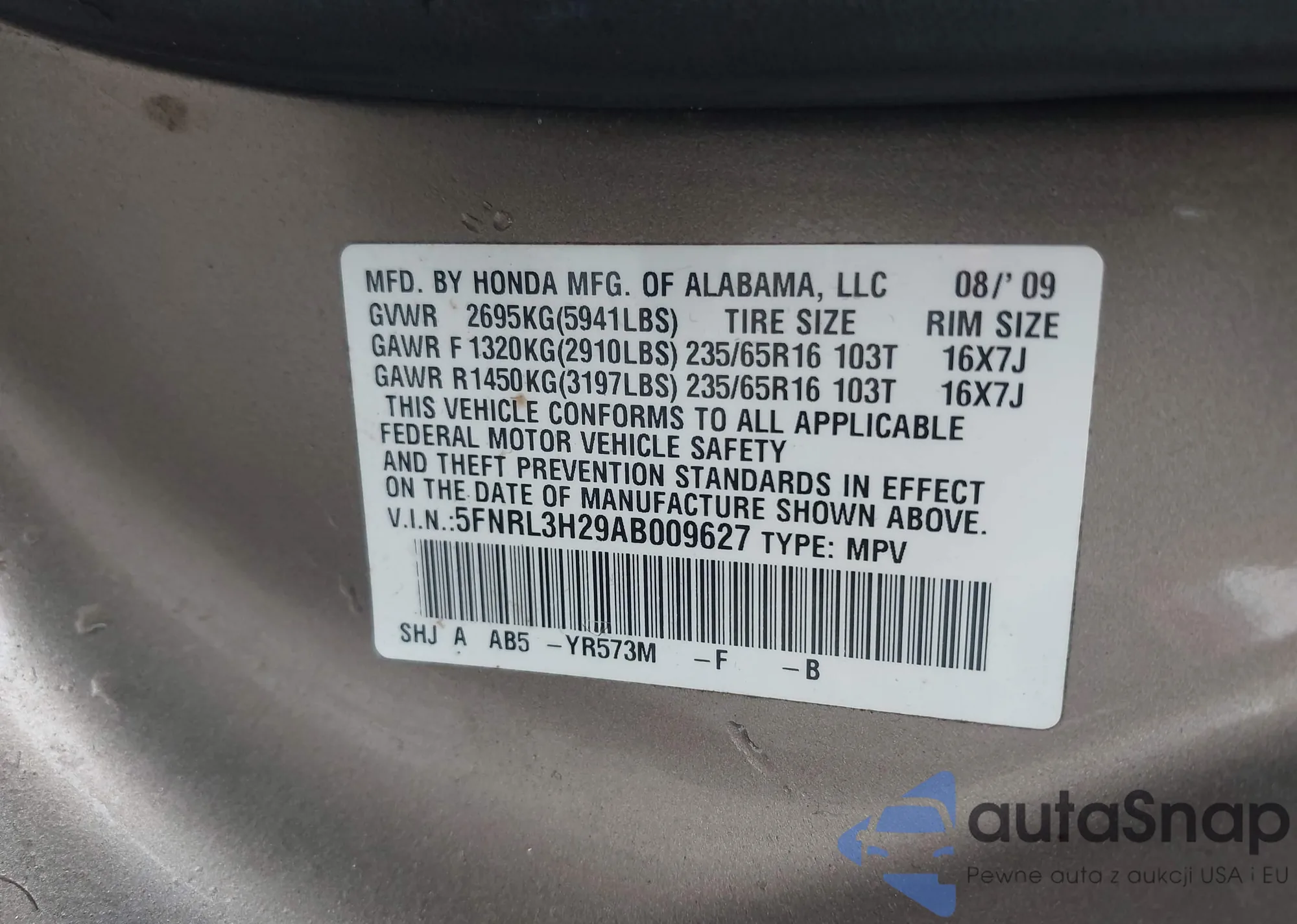 VIN: 5FNRL3H29AB009627