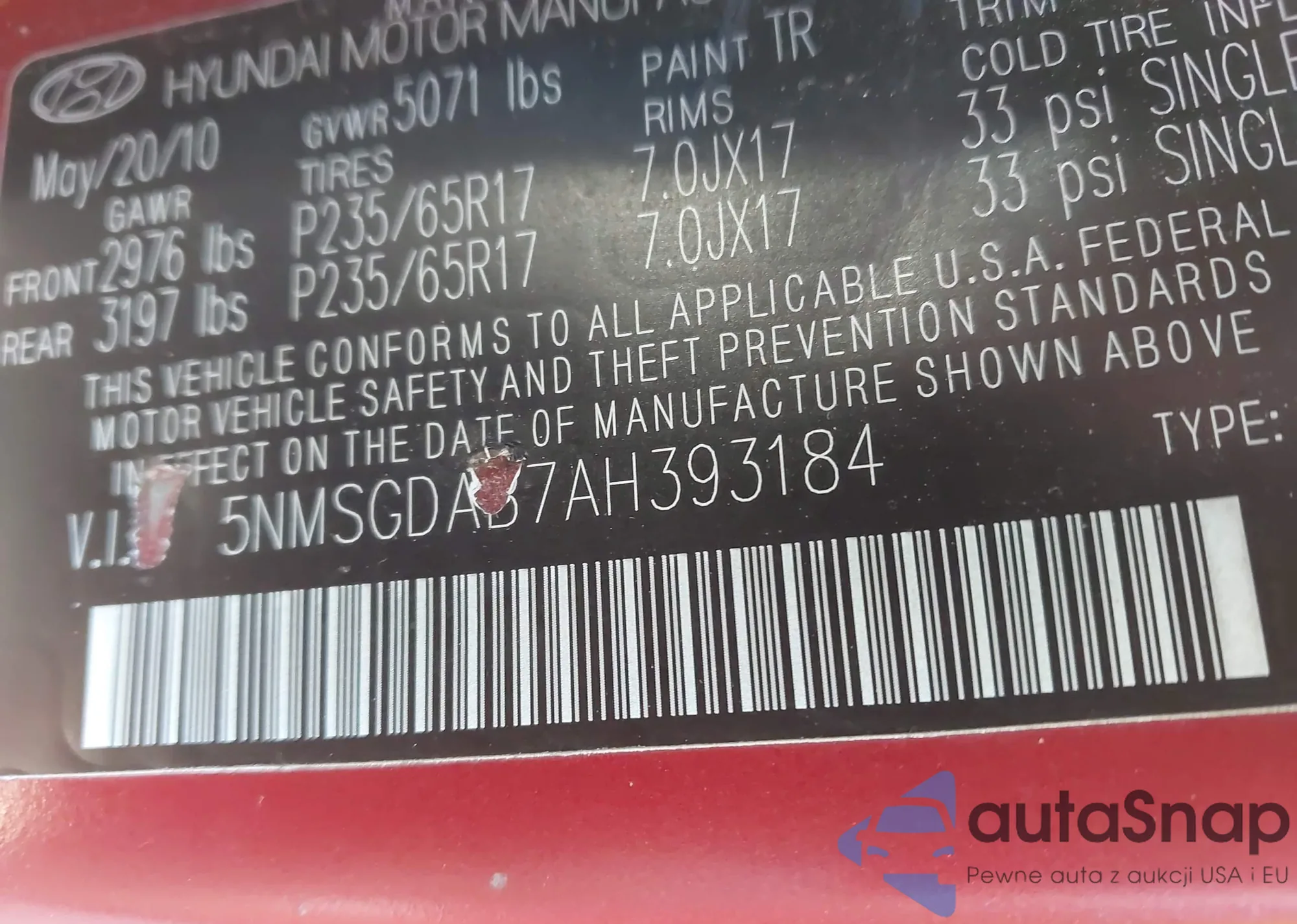 Samochód Hyundai Santa Fe 2010 (VIN 5NMSGDAB7AH393184) sprzedaje go niezweryfikowany sprzedawca. Zalecamy raport Carfax i potwierdzenie możliwości rejestracji pojazdu przed zakupem.