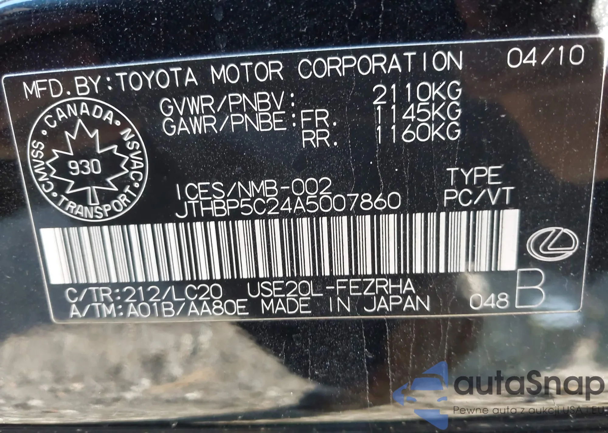 Samochód Lexus IS F 2010 (VIN JTHBP5C24A5007860) nie był wcześniej licytowany. Dokumenty są czyste, przebieg odpowiada lub jest niższy niż średnia rynku. Sprzedaje go firma ubezpieczeniowa – polecamy zakup. Dostawa do portu zajmie ok. 6–8 tygodni.
