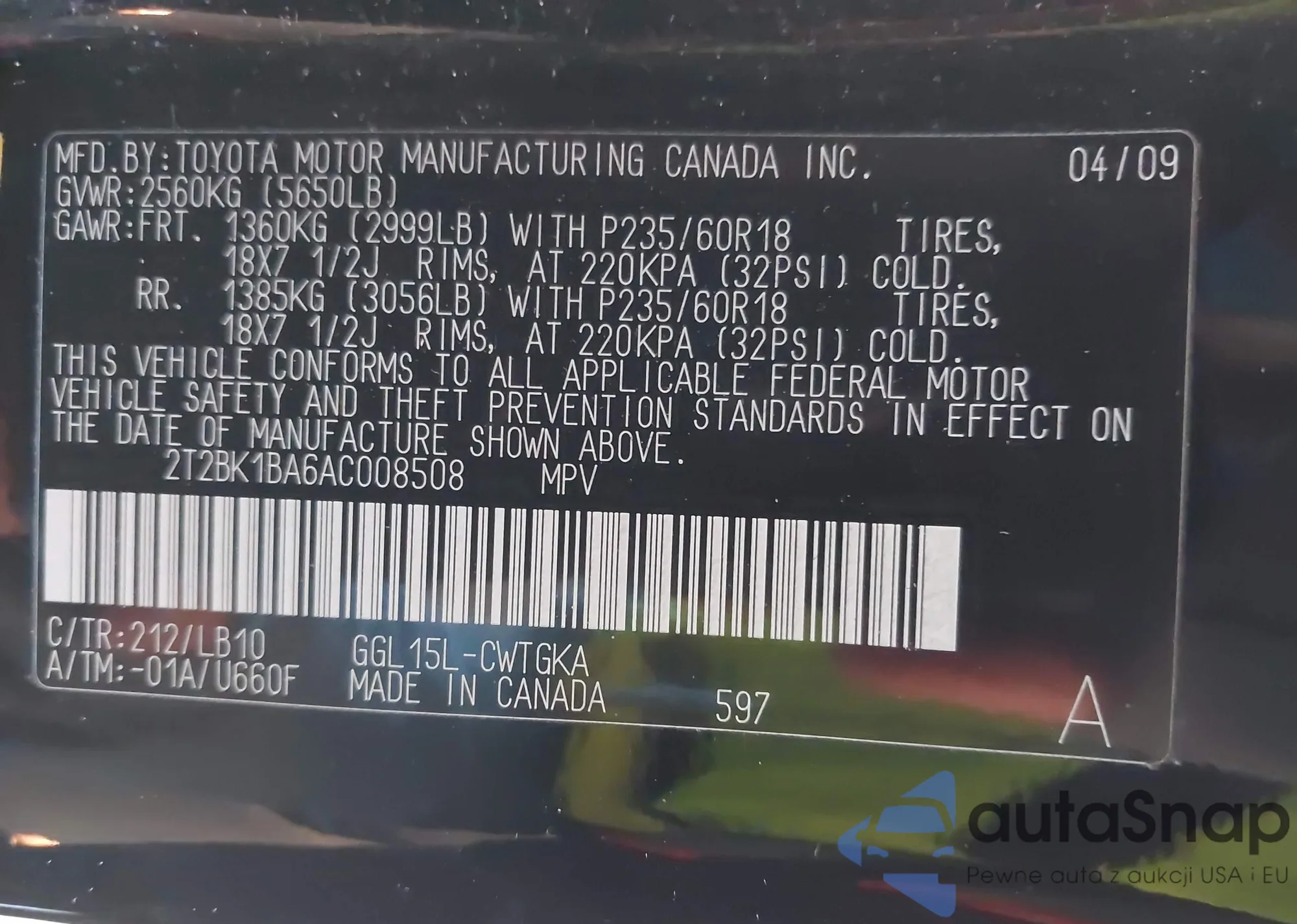 • VIN: 2T2BK1BA6AC008508