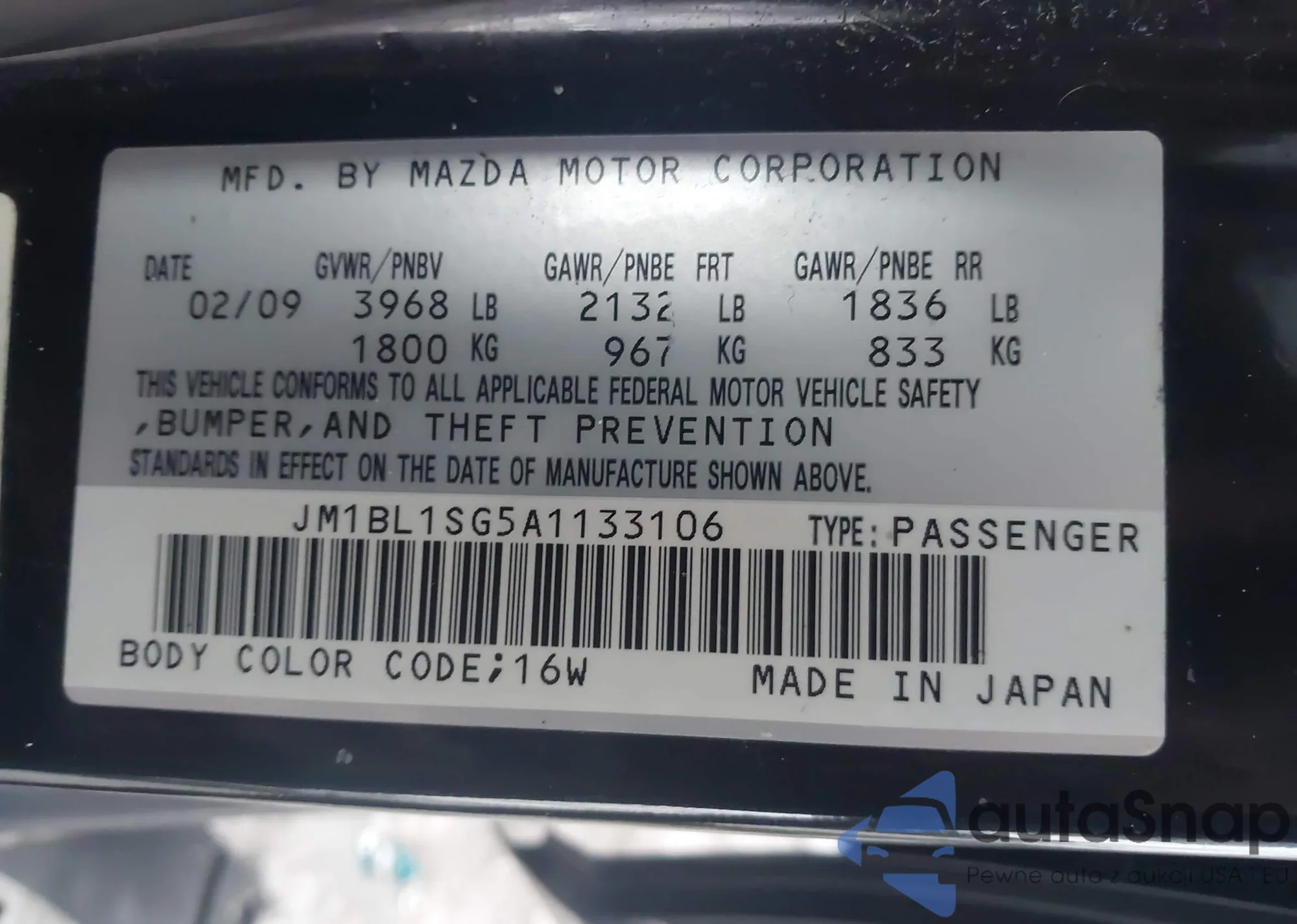 Samochód Mazda 3 2010 (VIN JM1BL1SG5A1133106) nie był wcześniej licytowany. Dokumenty są czyste, przebieg odpowiada lub jest niższy niż średnia rynku. Sprzedaje go firma ubezpieczeniowa – polecamy zakup. Dostawa do portu zajmie ok. 6–8 tygodni.