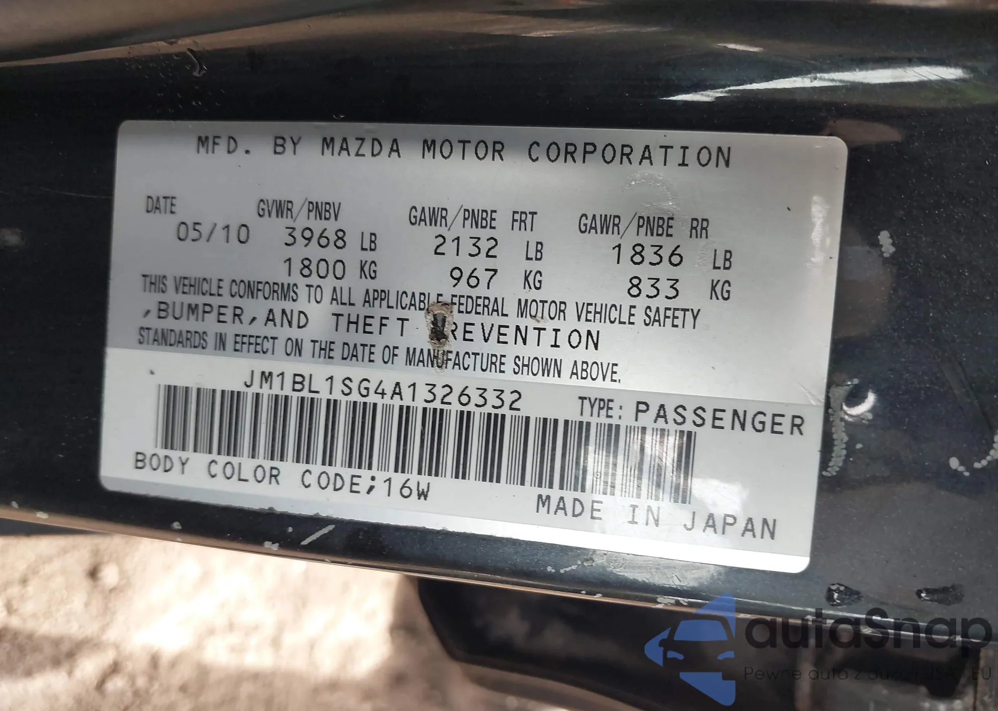 Samochód Mazda 3 2010 (VIN JM1BL1SG4A1326332) nie był wcześniej licytowany. Dokumenty są czyste, przebieg odpowiada lub jest niższy niż średnia rynku. Sprzedaje go firma ubezpieczeniowa – polecamy zakup. Dostawa do portu zajmie ok. 6–8 tygodni.