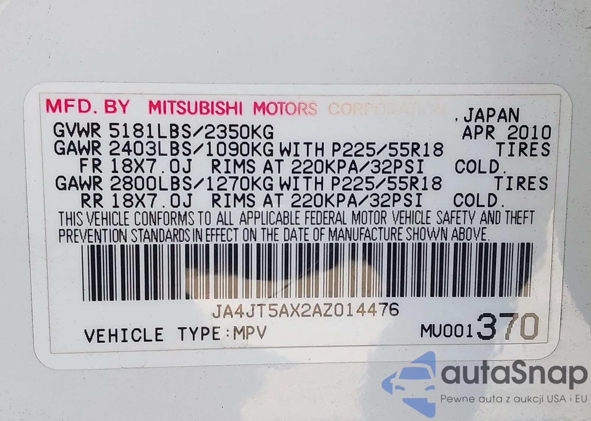 VIN: JA4JT5AX2AZ014476