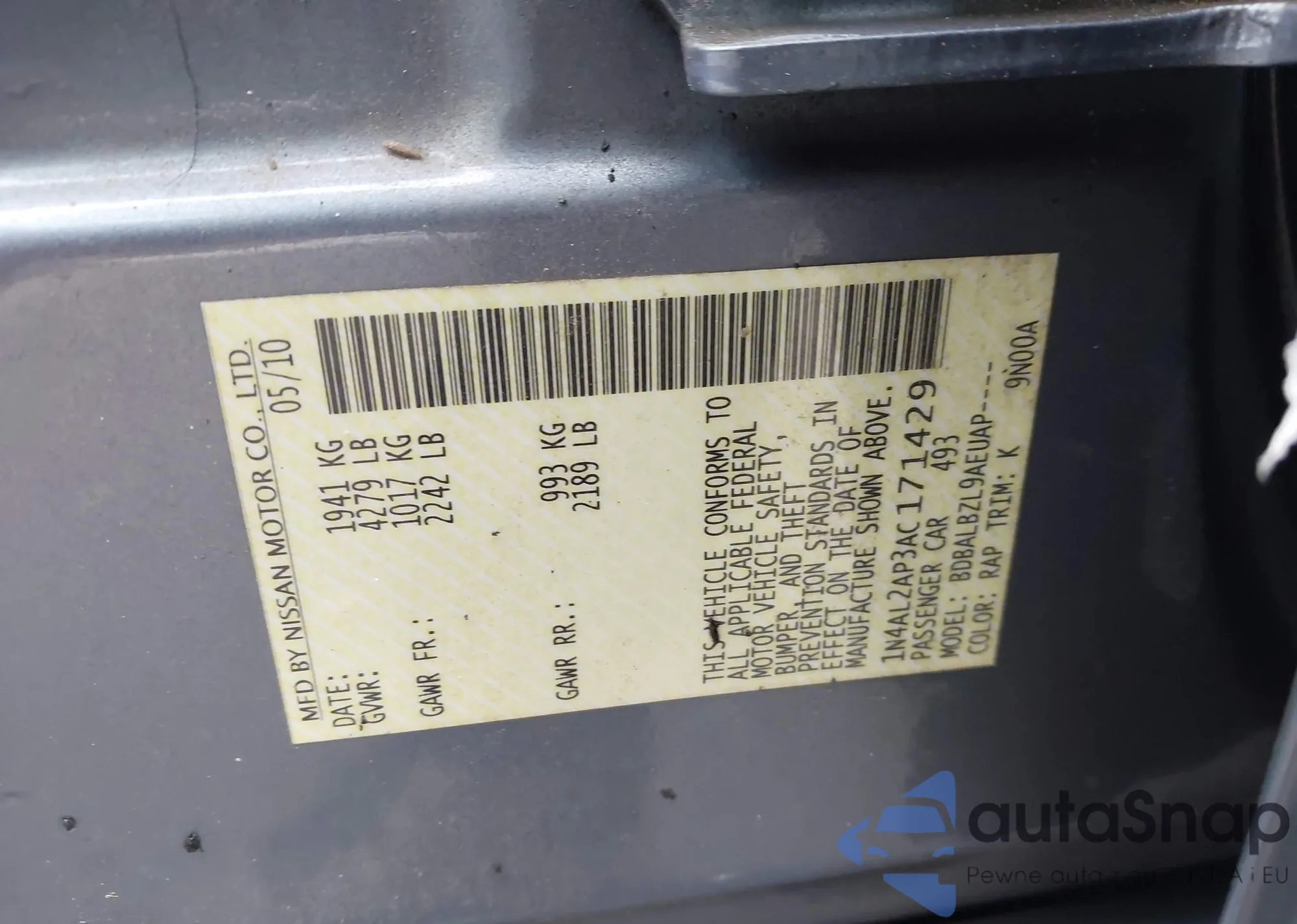 Samochód Nissan Altima 2010 (VIN 1N4AL2AP3AC171429) sprzedaje go niezweryfikowany sprzedawca. Zalecamy raport Carfax i potwierdzenie możliwości rejestracji pojazdu przed zakupem.